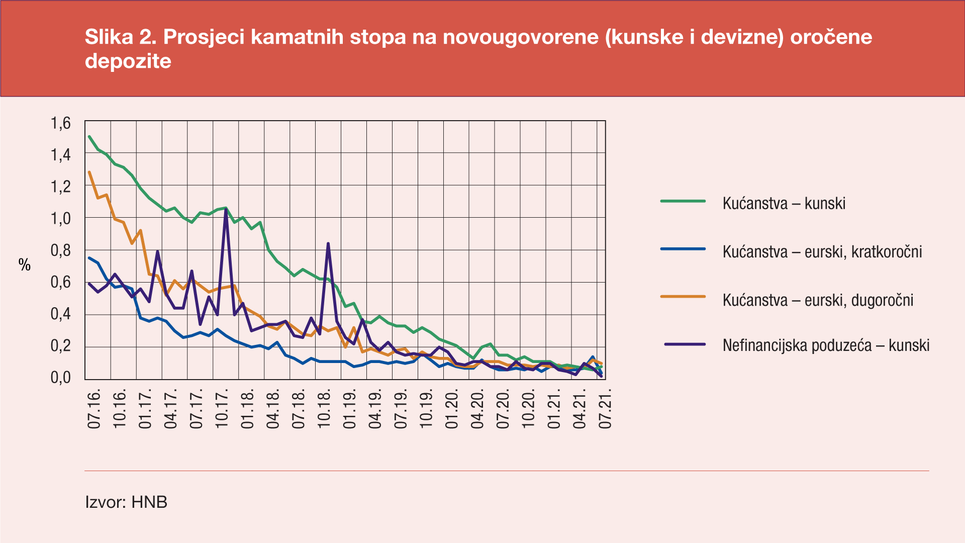 Kod oročenih (kunskih i deviznih) depozita u srpnju 2021. godine prosjeci kamatnih stopa za kunske depozite bili su znatno manji nego u istom mjesecu prethodne godine (za 0,07 postotnih bodova kod kućanstava i za 0,06 postotnih bodova kod nefinancijskih poduzeća), a za devizne depozite u eurima neznatno manji nego u srpnju 2020. godine (za 0,02 postotna boda manji za kratki rok i za 0,01 postotni bod manji za dugi rok). U srpnju 2021. godine prosjek kamatnih stopa za oročene kunske depozite kućanstava iznosio je 0,08%, a za dugoročno oročene eurske depozite kućanstava 0,10%. Najniži je bio prosjek kamatnih stopa za oročene kunske depozite nefinancijskih poduzeća (0,02%).