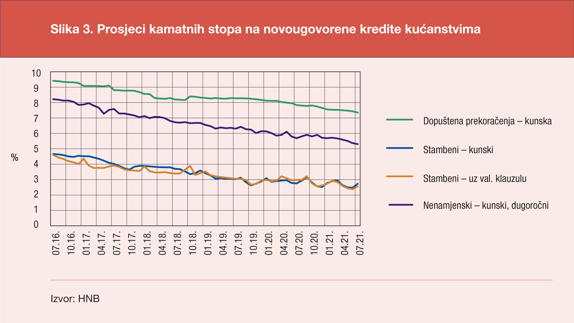 Kod glavnih kategorija kredita odobrenih kućanstvima, u srpnju 2021. godine najveći prosjek kamatnih stopa zabilježen je kod kunskih kredita na osnovi dopuštenih prekoračenja po transakcijskim računima (7,35% ili 0,48 postotnih bodova manje nego u srpnju 2020. godine), a najniži kod stambenih kredita odobrenih s valutnom klauzulom (2,56% ili 0,42 postotna boda manje nego u srpnju 2020. godine), pri čemu obje kategorije kredita imaju na tromjesečnoj i godišnjoj razini blagi trend pada.