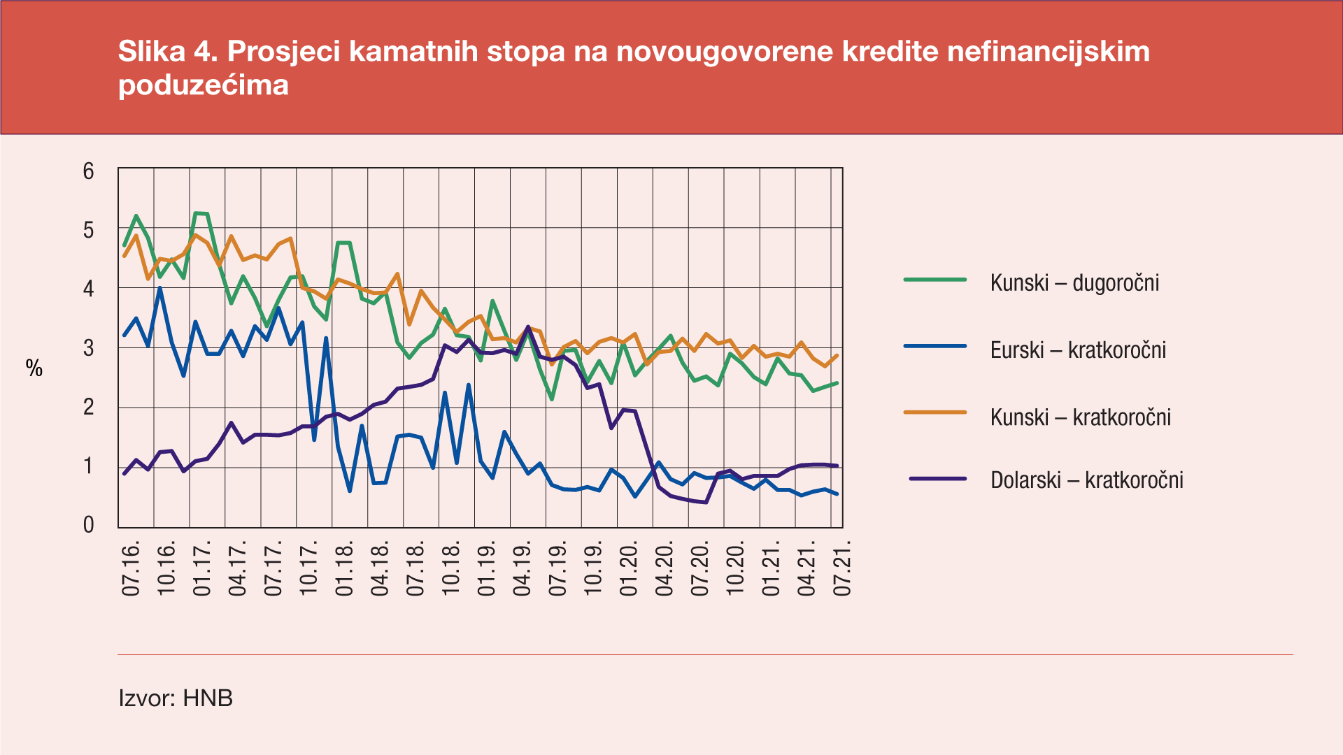 Kod glavnih kategorija kredita odobrenih nefinancijskim poduzećima, u srpnju 2021. godine najveći prosjek kamatnih stopa zabilježen je kod kratkoročnih kunskih kredita (2,87% ili 0,08 postotnih bodova manje nego u srpnju 2020. godine), a najniži kod kratkoročnih eurskih kredita (0,56% ili 0,35 postotnih bodova manje nego u srpnju 2020. godine).