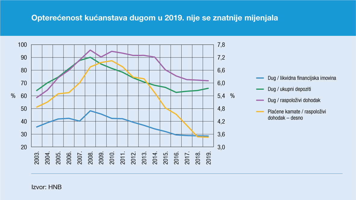 Rezultati tih analiza – na temelju podataka za prvih pet mjeseci ove godine – pokazuju da su zdravstveni i gospodarski šok znatno povećali rizike za financijski sustav. No, građani i osobito poduzeća iskoristili su prethodno povoljno razdoblje kako bi ojačali financijsku otpornost, a kreditne institucije u krizu ulaze s visokim rezervama kapitala i likvidnosti, što olakšava pružanje potpore gospodarstvu. Niz koordiniranih mjera fiskalne, monetarne i supervizorske politike očuvao je stabilnost financijskog sustava i ublažio gospodarske posljedica poremećaja. Zadržana je stabilnost tečaja i kamatnih stopa, a pogođena poduzeća pristupila su programu zaštite radnih mjesta. Također, poduzete su mjere s ciljem olakšavanja postupaka odgoda i reprograma kredita. Sve navedeno omogućilo je poduzećima i stanovništvu nastavak zaduživanja uz povoljne uvjete i zadržavanje iznimno niskih troškova servisiranja duga. Poduzeća su na narušene uvjete poslovanja, nakon dugog razdoblja razduživanja, reagirala pojačanim zaduživanjem kod banaka, kako bi prikupila sredstva za financiranje redovnog poslovanja. S druge strane, stanovništvo je zaustavilo zaduživanje po potrošačkim kreditima u svjetlu pogoršanja stanja na tržištu rada i izrazito nepovoljnih očekivanja, dok se rast stambenoga kreditiranja čak i ubrzao pod utjecajem programa državnog subvencioniranja.