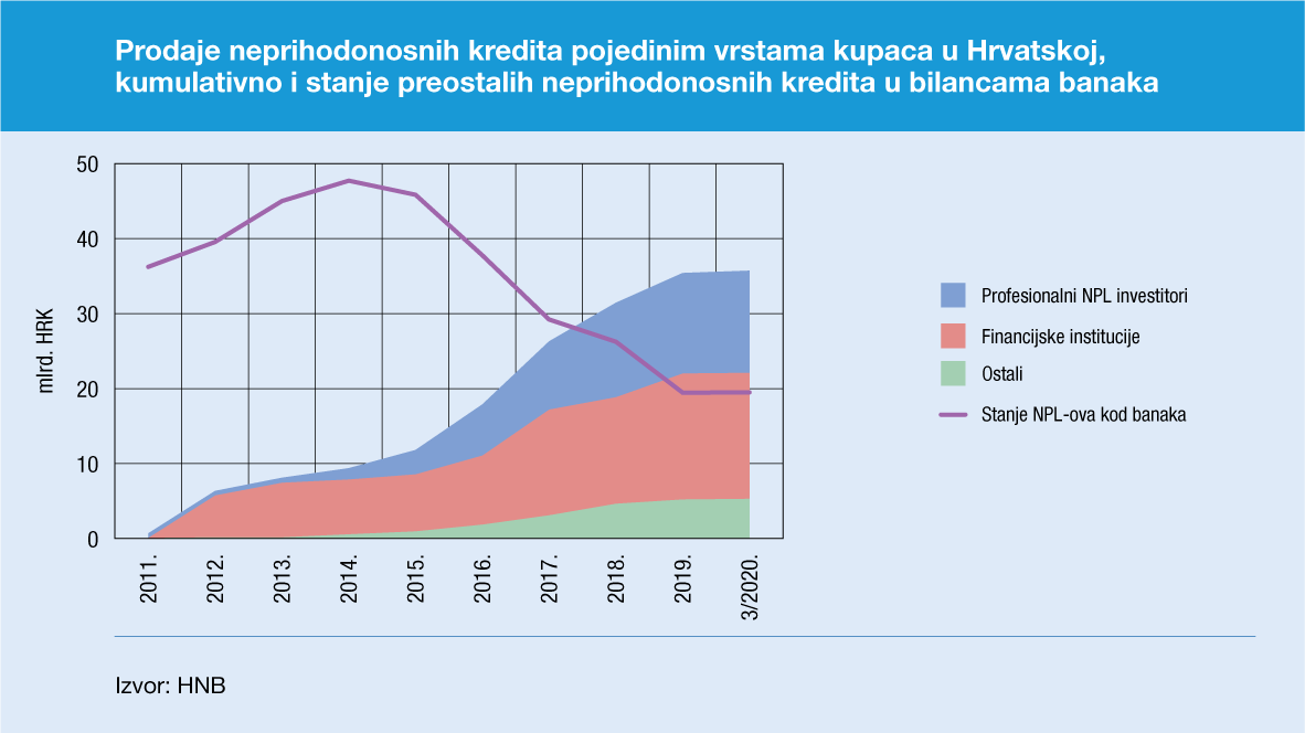 Intenzitet prodaje neprihodonosnih kredita (Non Performing Loans, NPL krediti) u Hrvatskoj usporavao se i prije gospodarskog šoka, kada je vjerojatno bio gotovo obustavljen. No, kako se može očekivati rast neprihodonosnih plasmana, a profesionalni NPL investitori raspolažu specifičnim znanjima i resursima, iznosi prodanih plasmana mogli bi ponovo porasti.