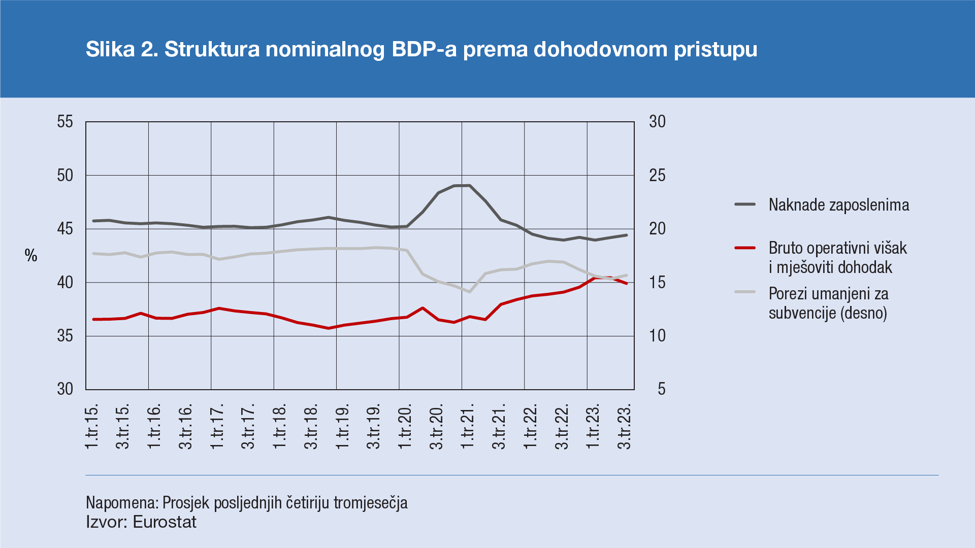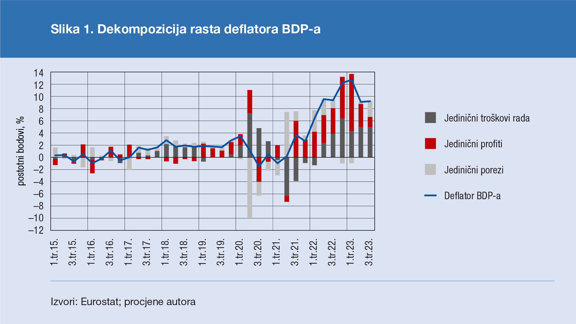 4. Valja uzeti u obzir da se profiti prema podacima iz nacionalnih računa aproksimiraju kategorijom bruto poslovnog viška i mješovitog dohotka, koja obuhvaća i određene elemente koji se ne bi smatrali profitima u užem smislu (Haskel, 2023.; Hahn, 2023.). Hahn, E. (2023.): How have unit profits contributed to the recent strengthening of euro area domestic price pressures?, svibanj 2023., poveznica: https://www.ecb.europa.eu/pub/economic-bulletin/focus/2023/html/ecb.ebbox202304_03~705befadac.en.html; Haskel, J. (2023.): What's driving inflation: wages, profits, or energy prices?, Speech given at the Peterson Institute for International Economics, Washington DC, 25. svibnja 2023.