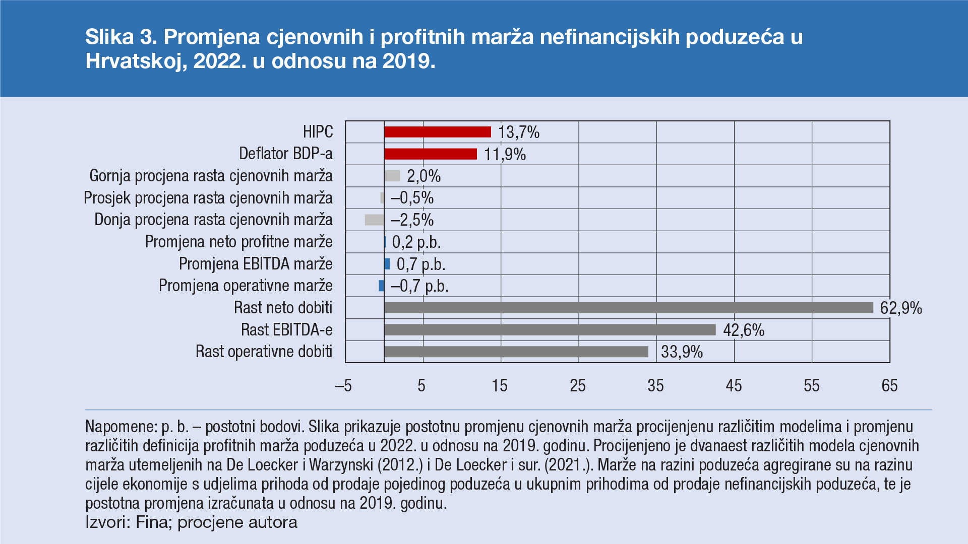 Snažno intenziviranje inflacije tijekom 2022. otvorilo je pitanje u kojoj mjeri inflacijskim pritiscima pridonose profiti i marže poduzeća. Doprinos jediničnih profita rastu deflatora BDP-a bio je u 2022. veći nego u dužem prethodnom razdoblju i ujedno veći od doprinosa jediničnih troškova rada i poreza. No, profitne marže nefinancijskih poduzeća u Hrvatskoj, nakon smanjenja u 2020., do 2022. vratile su se približno na razinu iz 2019., a ekonometrijske procjene cjenovnih marža upućuju na sličan zaključak. Zadržavanje marža na razmjerno stabilnoj razini naizgled eliminira profite poduzeća kao jednu od potencijalnih odrednica inflacije. Stabilne su marže u uvjetima izraženog rasta troškova intermedijarnih proizvoda, znatno bržeg od porasta gospodarske aktivnosti i plaća, zapravo u skladu s primjetnim porastom dobiti poduzeća i velikim doprinosom jediničnih profita rastu deflatora BDP-a. U razdoblju otklanjanja preostalih uskih grla u proizvodnim lancima i smanjenja cijena sirovina profiti poduzeća mogu poslužiti kao amortizer za inflatorne učinke vrlo snažnog rasta troškova rada.