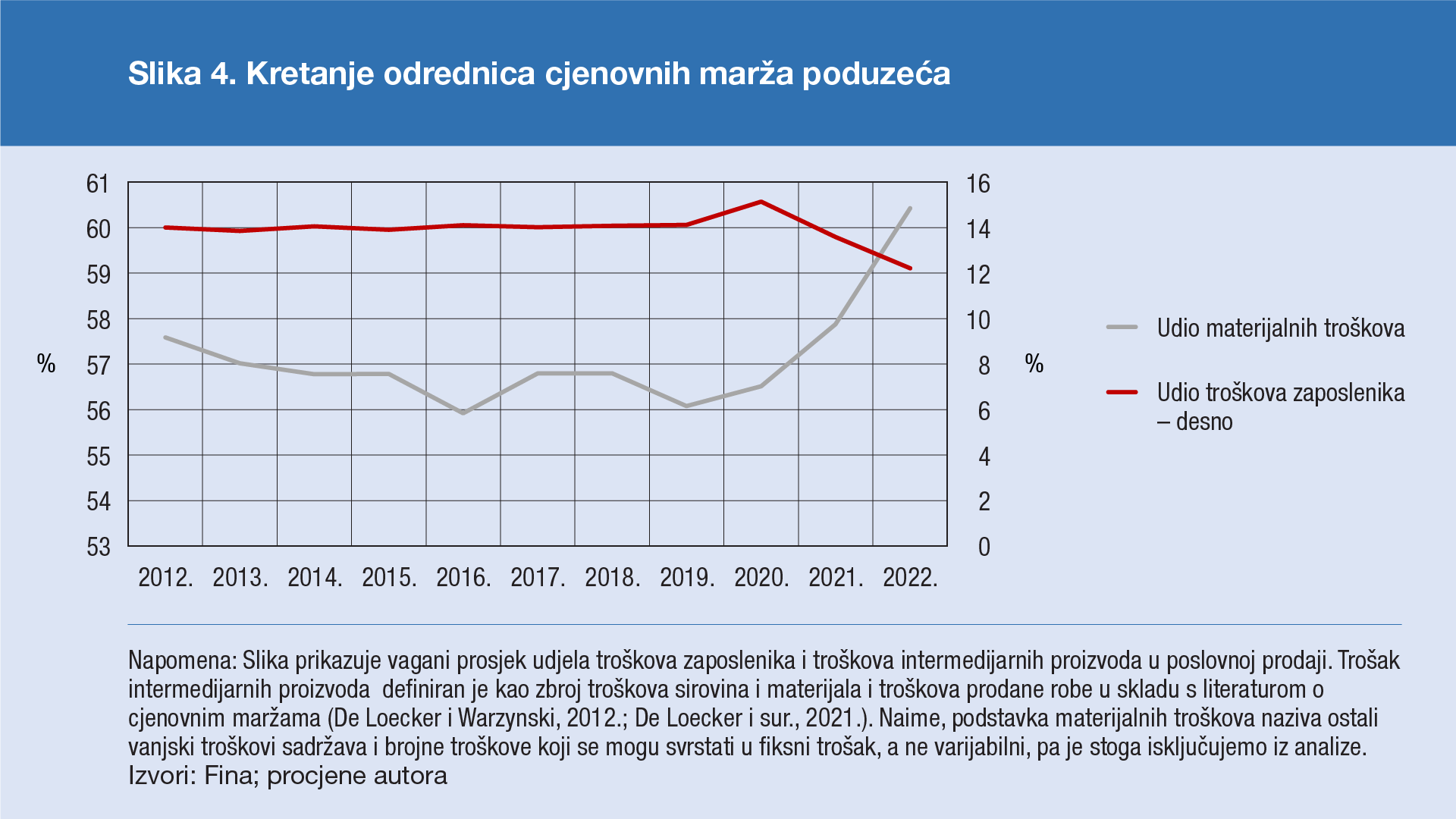 11. Prema ekonomskoj teoriji kretanje omjera troškova varijabilnih inputa i prodaje obrnuto je proporcionalno kretanju marža, pod pretpostavkom da u kratkom roku nema velikih promjena u tehnologiji proizvodnje (De Loecker i Warzynski, 2012.; De Loecker i sur., 2021.). Osim toga, ako pretpostavimo da su rad i intermedijarni inputi varijabilni faktori proizvodnje, onda su kretanja udjela njihovih troškova u poslovnoj prodaji obrnuto proporcionalna kretanju marža.