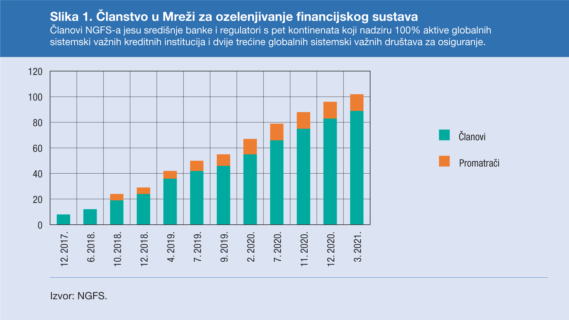 NGFS, koji je u početku brojio osam članova, porastao je na 89 članova i 13 promatrača te su mu se osim središnjih banaka te regulatora banaka i osiguravajućih društava pridružile i mnoge razvojne banke i međunarodne financijske institucije (Slika 1.).