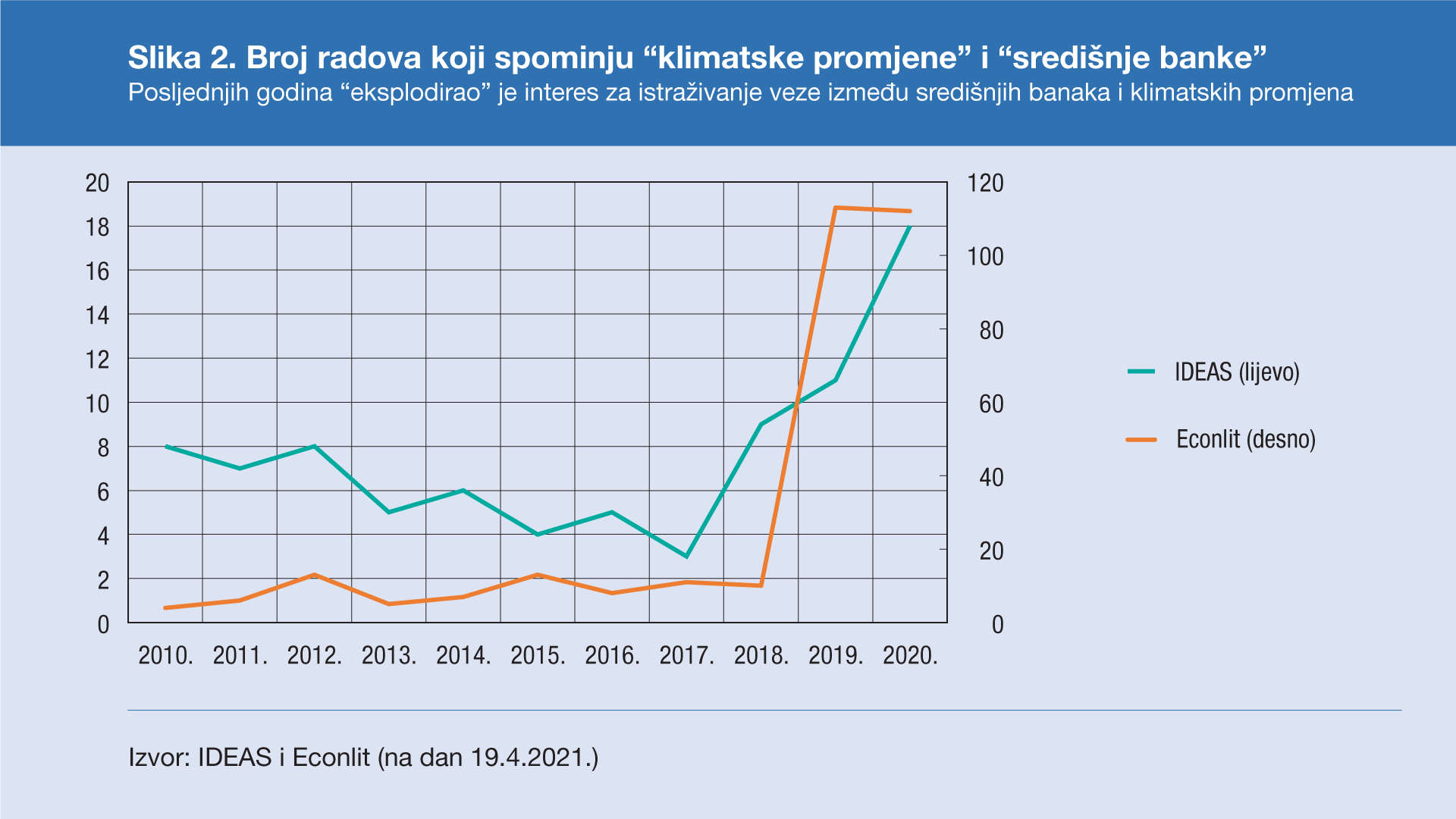 Nakon Pariškoga klimatskog sporazuma, kojim je poslan poziv da se u borbu protiv klimatskih promjena uključi široka koalicija institucija, a ne samo države, odnosno vlade, naglo je porastao i interes za istraživanje veze između središnjih banaka i klimatskih promjena. Međunarodne bibliografske baze danas obuhvaćaju stotine radova nastalih u posljednje tri godine, koji se bave različitim aspektima utjecaja klimatskih promjena na ostvarivanje ciljeva središnjih banaka, odnosno uloge središnjih banaka u borbi protiv klimatskih promjena (Slika 2.).