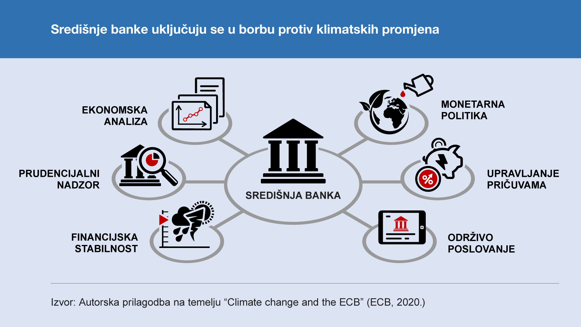 Konsenzus da klimatske promjene predstavljaju rizik za financijski sustav nagnao je središnje banke da uvaže klimatske rizike pri nadzoru nad bankama, te ih ugrade u analize i politike usmjerene na očuvanje financijske stabilnosti. Središnje banke postupno uspostavljaju mehanizme za identificiranje izloženosti poslovnih banaka klimatskih rizicima te potiču poslovne banke na uspostavu kvalitetnih sustava praćenja klimatskih rizika. Tako je sredinom prošle godine Europska središnja banka objavila dokument u kojem je opisala procedure koje će primjenjivati pri nadzoru klimatskih rizika. Na razini očuvanja stabilnosti financijskog sustava potrebno je jačati razumijevanje djelovanja i izloženosti klimatskim rizicima, te ugraditi ocjenu klimatskih rizika u redovite analize i testove otpornosti na stres.