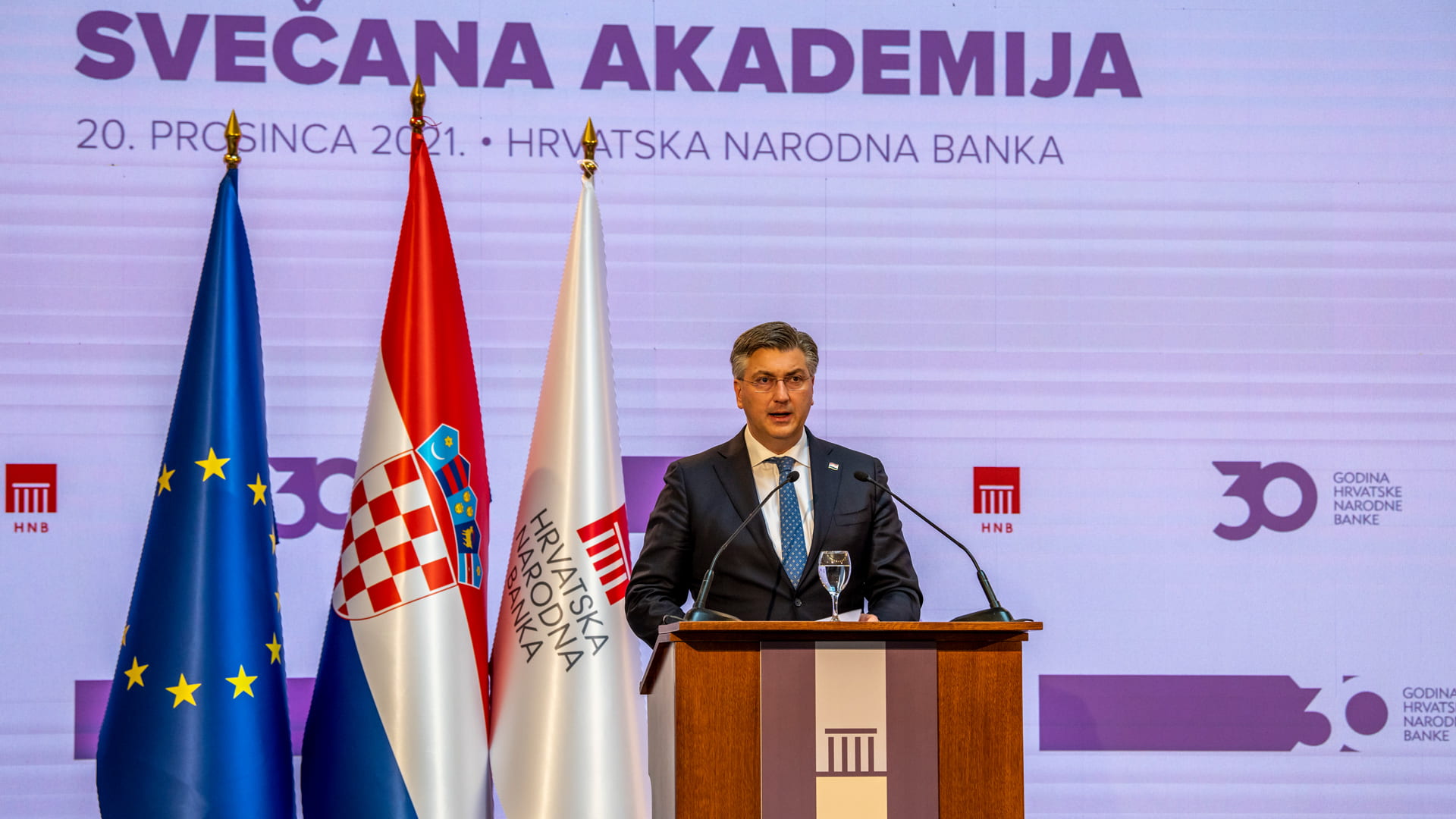 Uzvanicima se obratio i predsjednik Vlade Republike Hrvatske, Andrej Plenković. "Ova obljetnica stožerne institucije hrvatskoga monetarnog sustava dolazi u zahtjevnim okolnostima pandemije, tj. njezinih posljedica na gospodarstvo, financije, tržište rada i opće ozračje u hrvatskom društvu, ali dolazi i u transformacijskom trenutku kada se Hrvatska ubrzano integrira u europodručje. Usvajanje eura za Hrvatsku će biti ključan korak prema jačanju konkurentnosti i većoj ekonomskoj suverenosti. Cilj nam je zagovaranje nacionalnih interesa koristeći se članstvom u međunarodnim organizacijama, ponajprije u Europskoj uniji, zatim podizanje konkurentnosti, inovativnosti i otpornosti gospodarstva te poboljšanje standarda građana. Ovo je desetljeće u kojem ćemo, uvjeren sam, zajedničkim naporima osigurati sve te ciljeve", poručio je premijer.