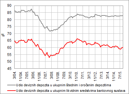 U Hrvatskoj je najveći dio kredita vezan uz stranu valutu. Valutna klauzula u kreditnim odnosima, odnosno vezanje kredita uz tečaj kune prema nekoj stranoj valuti, posljedica je činjenice da je oko 80% štednih i oročenih depozita u bankama u stranoj valuti, pretežito eurima (Slika 3.). Tako visok stupanj depozitne euroizacije povezan je s negativnim povijesnim iskustvima štediša tijekom razdoblja visoke inflacije i hiperinflacije te devalvacije i snažnog slabljenja domaće valute u odnosu na njemačku marku te ukupne makroekonomske stabilnosti koje su obilježile 70-e i 80-e godine prošlog stoljeća i razdoblje od hrvatskog osamostaljenja do provođenja stabilizacijskog programa 1993., kao i s deviznim priljevima od turizma te doznaka iz inozemstva od emigranata, pomoraca i sl.