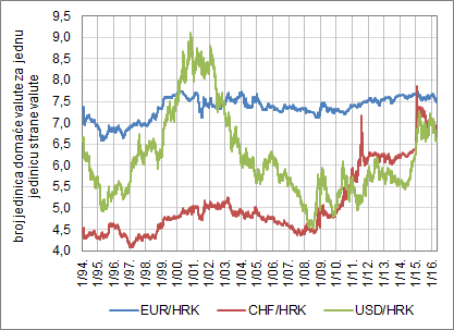 Vrijednost kune prema drugim valutama koje su na tečajnici HNB-a, uključujući švicarski franak i američki dolar, izračunava se na temelju odnosa eura i tih valuta na svjetskim deviznim tržištima i na njih HNB nema utjecaja. Od uvođenja eura 1. siječnja 1999. do kraja 2015. prosječni mjesečni tečaj kune prema euru fluktuirao je u rasponu od 7,11 do 7,74 kune za jedan euro, a prosječni dnevni tečaj u tom je razdoblju iznosio 7,46 kuna za jedan euro (Slika 5.).
