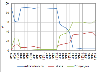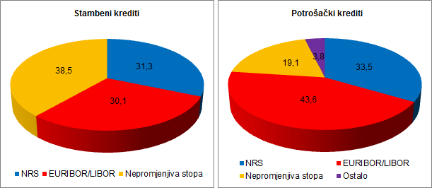 Napomena: Procjena zastupljenosti pojedinoga referentnog promjenjivog parametra zasnovana je na informacijama o promjenjivom parametru oglašenom na internetskim stranicama banaka za pojedinu vrstu kredita te udjela pojedine banke u ukupnom odobrenom iznosu pojedine vrste kredita na kraju veljače 2015. Kod stambenih kredita stanovništvu kategorija nepromjenjiva stopa gotovo se u cijelosti odnosi na stambene kredite odobrene u švicarskom franku ili vezane uz tečaj švicarskog franka, a kod kojih je tečaj ugovorene strane valute u odnosu na ugovoreni tečaj na dan prvog korištenja kredita aprecirao za više od 20% (članak 3. stavak 5. Zakona o izmjenama i dopunama Zakona o potrošačkom kreditiranju, NN, br. 143/2013.).