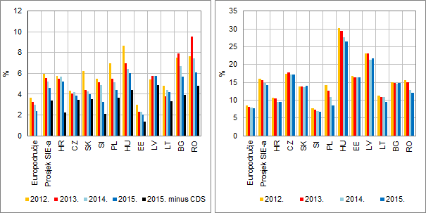 Napomena: Kamatne stope odnose se na jednostavni prosjek mjesečnih kamatnih stopa u određenoj godini. Oznakom "2015. minus CDS" prikazana je kamatna stopa za stambene kredite umanjena za premiju rizika države, mjerena kreditnim izvedenicama na osnovi nastanka statusa neispunjavanja obveza (engl. credit default swap ili CDS).