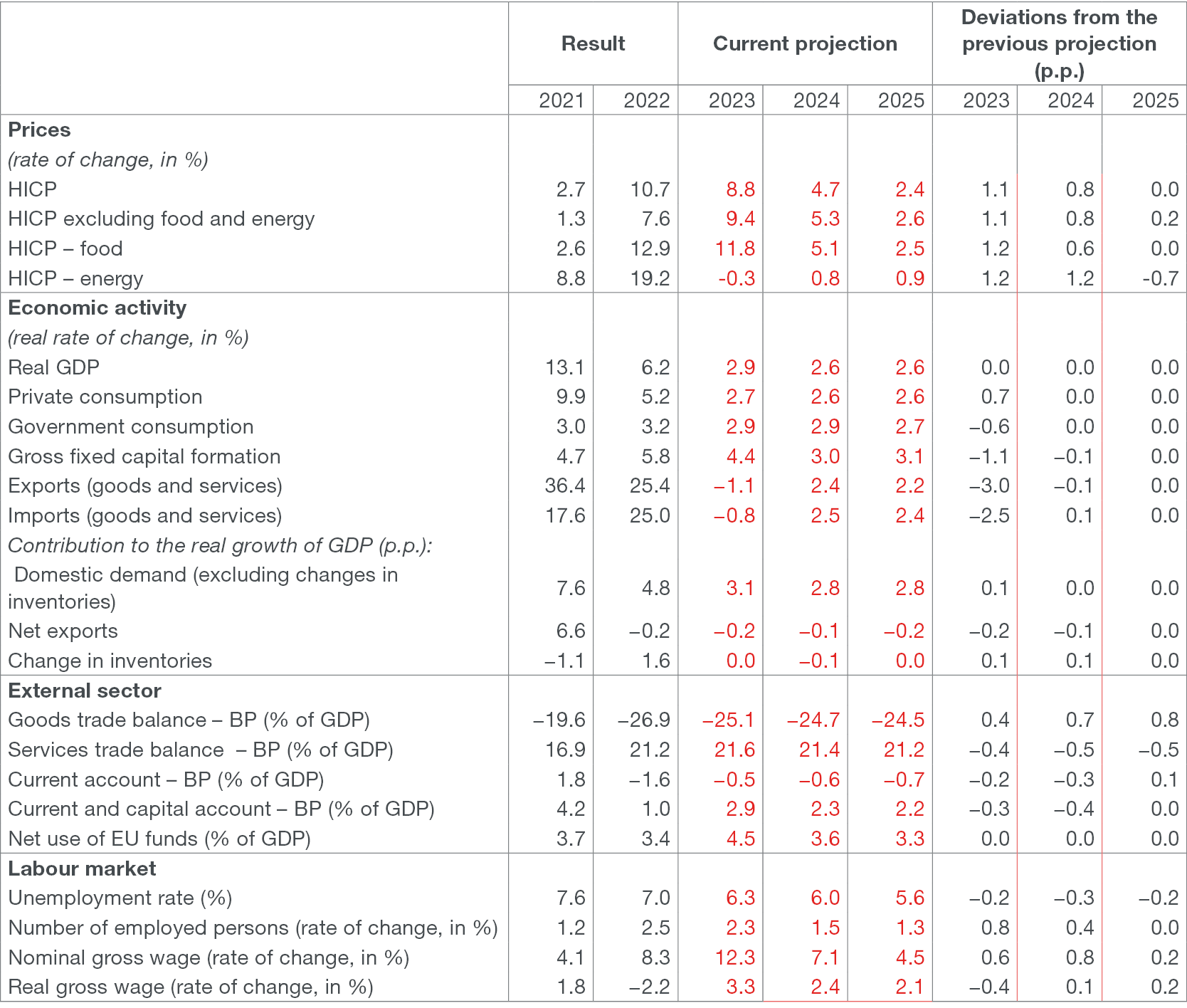 Following a temporary rise in August due to the increase in energy prices, inflation is expected to continue its declining path and decrease from 10.7% in 2022 to an estimated 8.8% in 2023, before falling further to 4.7% in 2024 and 2.4% in 2025. The decrease in inflation in 2023 is mostly driven by declines in energy inflation, even though the limited supplies of crude oil in the world market have recently pushed inflation up. Food price inflation has also trended down amid still considerably lower energy prices relative to the exceptionally high levels recorded in mid-2022 and the decline in food commodity prices in the global market. Against the backdrop of normalised global supply chains, lower prices of energy and other raw materials should also slow down the rise in the prices of industrial products. In contrast, core inflation (excluding the price of energy and food) might accelerate to 9.4% in 2023. Services inflation remained at high levels in recent months and might grow more than previously anticipated in the whole of 2023. Services inflation is primarily spurred by catering and accommodation services, while factors driving the rise in their prices include, among other things, the previous cost increases caused by the rise in energy and food prices, labour shortages and the ensuing increase in wages, a robust demand for tourist services, as well as the continued process of the convergence of services prices to the average level in the euro area. Risks to inflation projections have remained elevated. In addition to higher energy prices, which have partly materialised in recent months, the risks of a slower decline in inflation include the possibility of a stronger growth in food prices, spurred by potential adverse weather conditions and Russia’s withdrawal from the Black Sea Grain Initiative. Moreover, inflation might also turn out to be higher in the case of a stronger growth in wages, especially in the absence of a decrease in profit margins which would absorb a part of wage cost pressures. On the other hand, a slump in demand, a stronger impact of monetary policy tightening and a more pronounced spillover of the decline in the prices of energy and other raw materials to consumer prices of goods and services might push inflation below its projected path.