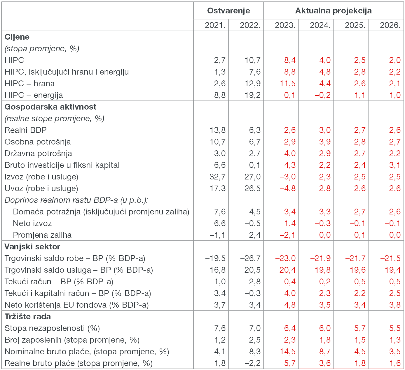 Inflacija se, zahvaljujući slabljenju tekućih inflacijskih pritisaka i iščezavanju učinaka ranijih poskupljenja svih glavnih komponenti, kontinuirano smanjivala kroz veći dio 2023., a takav se trend očekuje i u 2024. Prema trenutnim ocjenama, prosječna inflacija mogla bi u 2023. iznositi 8,4%, a sljedeće godine se usporiti na 4,0%. Usporavanje inflacije u tekućoj godini u prvom je redu rezultat znatno nižih cijena energije u usporedbi s iznimno visokim razinama u 2022. Uz pretpostavku nepromijenjenih cijena struje i plina u 2024. te uz očekivano blago smanjenje cijene sirove nafte na svjetskom tržištu, inflacija cijena energije mogla bi ostati niska i sljedeće godine. Trendu usporavanja inflacije u tekućoj godini u manjoj mjeri pridonosi i smanjenje inflacije cijena hrane koje bi moglo biti još izraženije u 2024. Dok bi u tekućoj godini učinak usporavanja inflacije cijena energije i hrane mogao biti poništen povećanjem cijena ostalih komponenti inflacije, naredne se godine očekuje primjetno usporavanje temeljne inflacije. Ipak, zbog izraženih bi se pritisaka s tržišta rada, kao i snažne potražnje, temeljna inflacija tijekom 2024. mogla zadržati na razini iznad 4%, pri čemu bi u kratkom roku inflacija cijena usluga mogla ostati nešto izraženija nego inflacija cijena industrijskih dobara. U ostatku projekcijskog horizonta, u uvjetima slabljenja troškovnih pritisaka i povišenih kamatnih stopa, očekuje se nastavak usporavanja inflacije na 2,5% u 2025. te povratak na ciljanu razinu od 2,0% u 2026. godini. Rizici vezani uz ostvarivanje predviđene inflacije i dalje su izraženi, ali se ocjenjuju uravnoteženima. Geopolitičke napetosti i dalje predstavljaju moguće izazove u opskrbi energijom i drugim sirovinama, što bi moglo rezultirati povećanjem njihovih cijena. Osim toga, nepovoljni vremenski uvjeti mogli bi potaknuti neočekivani rast cijena hrane. To bi pak moglo usporiti predviđeni pad inflacijskih očekivanja i rezultirati snažnijim pritiskom na povećanje plaća. Inflacija bi mogla biti viša i u slučaju da ne dođe do očekivanog smanjenja doprinosa profita inflaciji, koje bi u određenoj mjeri kompenziralo utjecaj rasta plaća. S druge strane, slabija potražnja, jači učinci zaoštravanja monetarne politike te izrazitije prelijevanje pada cijena energenata i drugih sirovina na svjetskom tržištu na potrošačke cijene dobara i usluga, rizici su koji bi mogli utjecati da inflacija bude niža od projicirane.