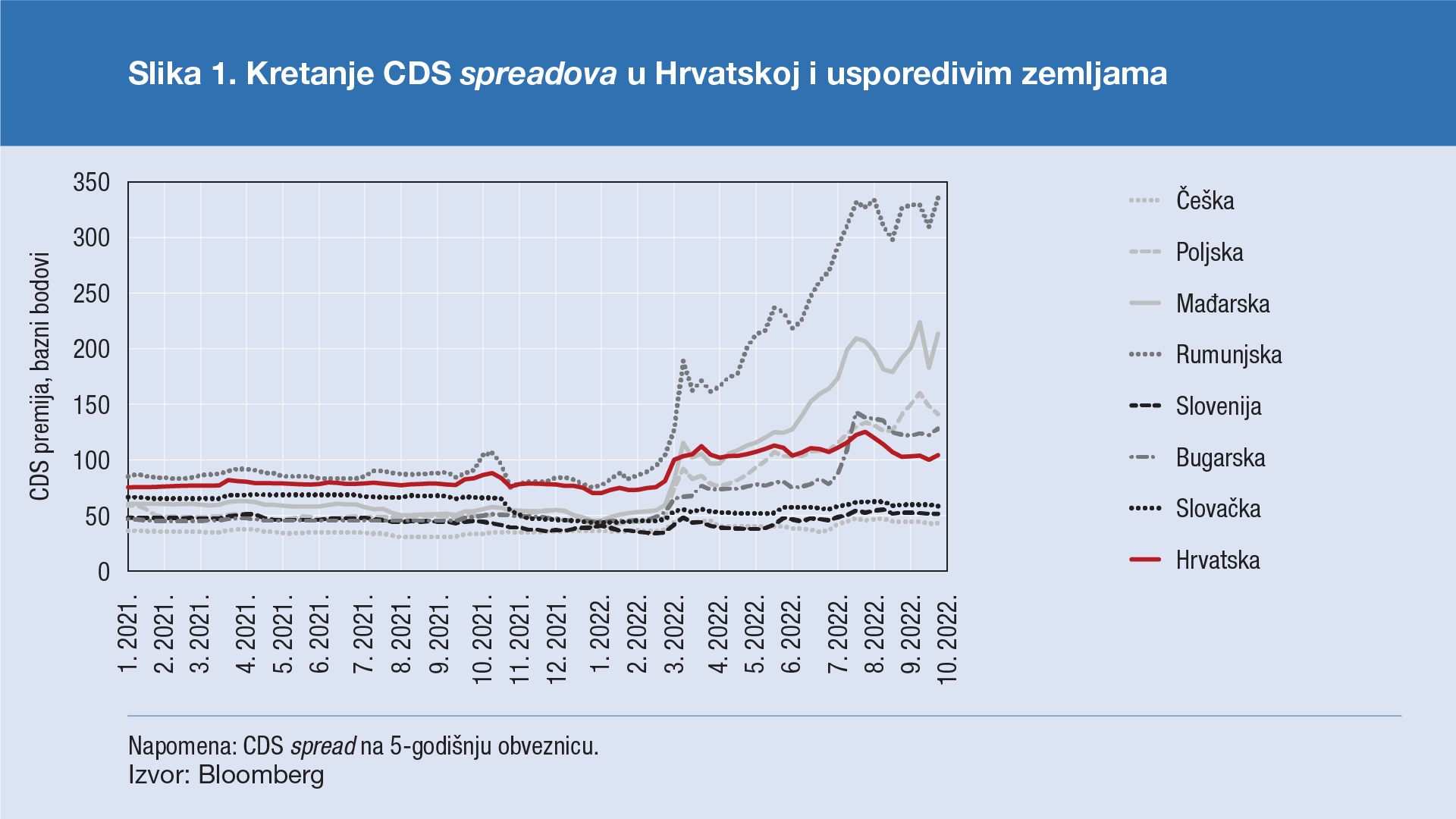 CDS spread na državnu obveznicu povećao se od početka godine, ali taj je rast bio zamjetno manji od rasta nekih usporedivih zemalja. Na početku 2022. godine percipirana rizičnost Hrvatske u odnosu na usporedive zemlje bila je druga po veličini, odmah nakon Rumunjske. Porast CDS spreadova bio je veoma snažan za zemlje koje nisu dio europodručja (siva boja), izuzevši Češku, dok je za usporedive zemlje koje su dio europodručja bio ograničen (crna boja). Do kraja rujna vjerojatnost neispunjavanja obveza Republike Hrvatske manja je od brojnih usporedivih zemalja kao što su Rumunjska, Mađarska, Bugarska i Poljska, a sve su one, valja naglasiti, izvan europodručja. Međutim, teško je tvrditi da je kretanje CDS spreadova u Hrvatskoj bilo povoljnije upravo zbog ulaska u europodručje. CDS spreadovi bili su ove godine uglavnom određeni stezanjem monetarne politike i učincima rata u Ukrajini. Različite zemlje mogle su biti različito pogođene tim šokovima, primjerice Poljska i Rumunjska potencijalno su više izložene rizicima proizašlim iz rata u Ukrajini od Hrvatske.