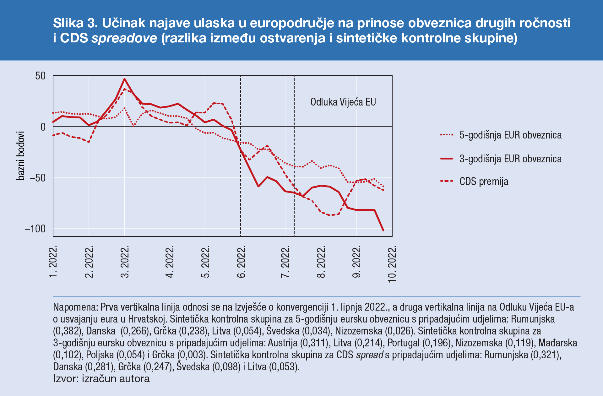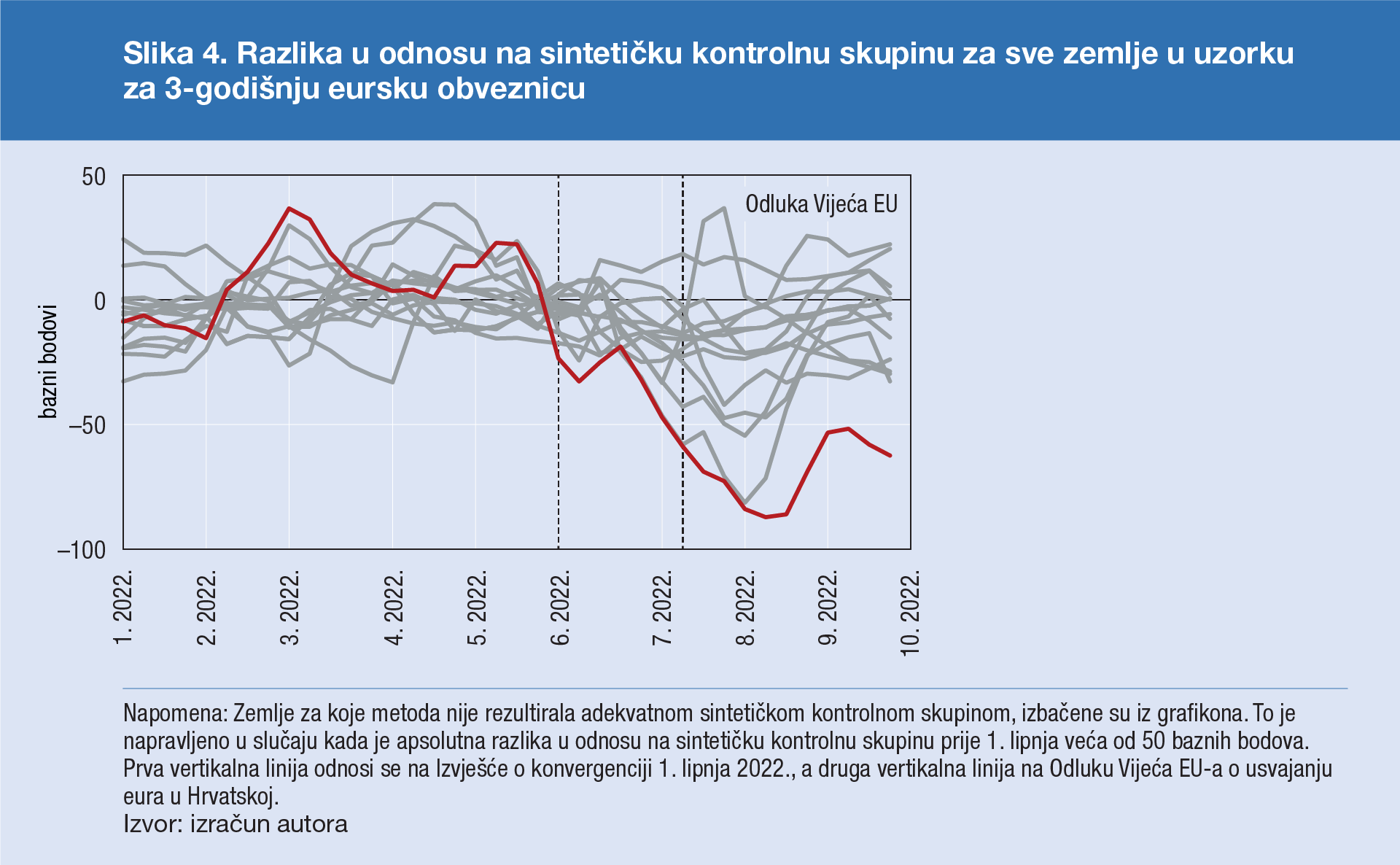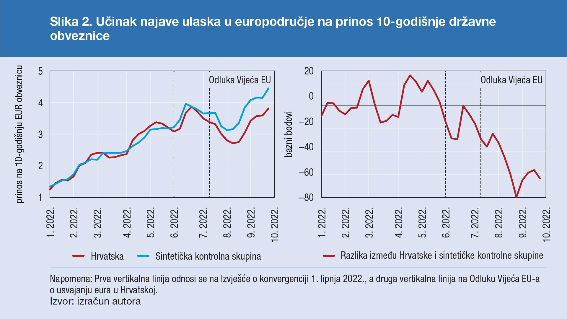 Prikazani rezultati vrlo su oprezna procjena stvarnih učinaka jer je dio učinka usvajanja eura vjerojatno ugrađen u prinose i prije same Odluke Vijeća EU-a. Pad u prinosima vidljiv je i nakon objave Izvještaja o konvergenciji 1. lipnja (prva vertikalna linija) kada je Europska komisija objavila da je Hrvatska zadovoljila kriterije za ulazak u europodručje. Vjerojatno je i prije toga dio investitora očekivao ulazak u europodručje 1. siječnja 2023. Međutim, postojala je neizvjesnost glede ispunjavanja kriterija za uvođenje eura, osobito zbog uvjeta visoke inflacije, te se stoga ovaj rezultat može promatrati kao dodatni učinak smanjenja neizvjesnosti povodom ulaska u europodručje.
