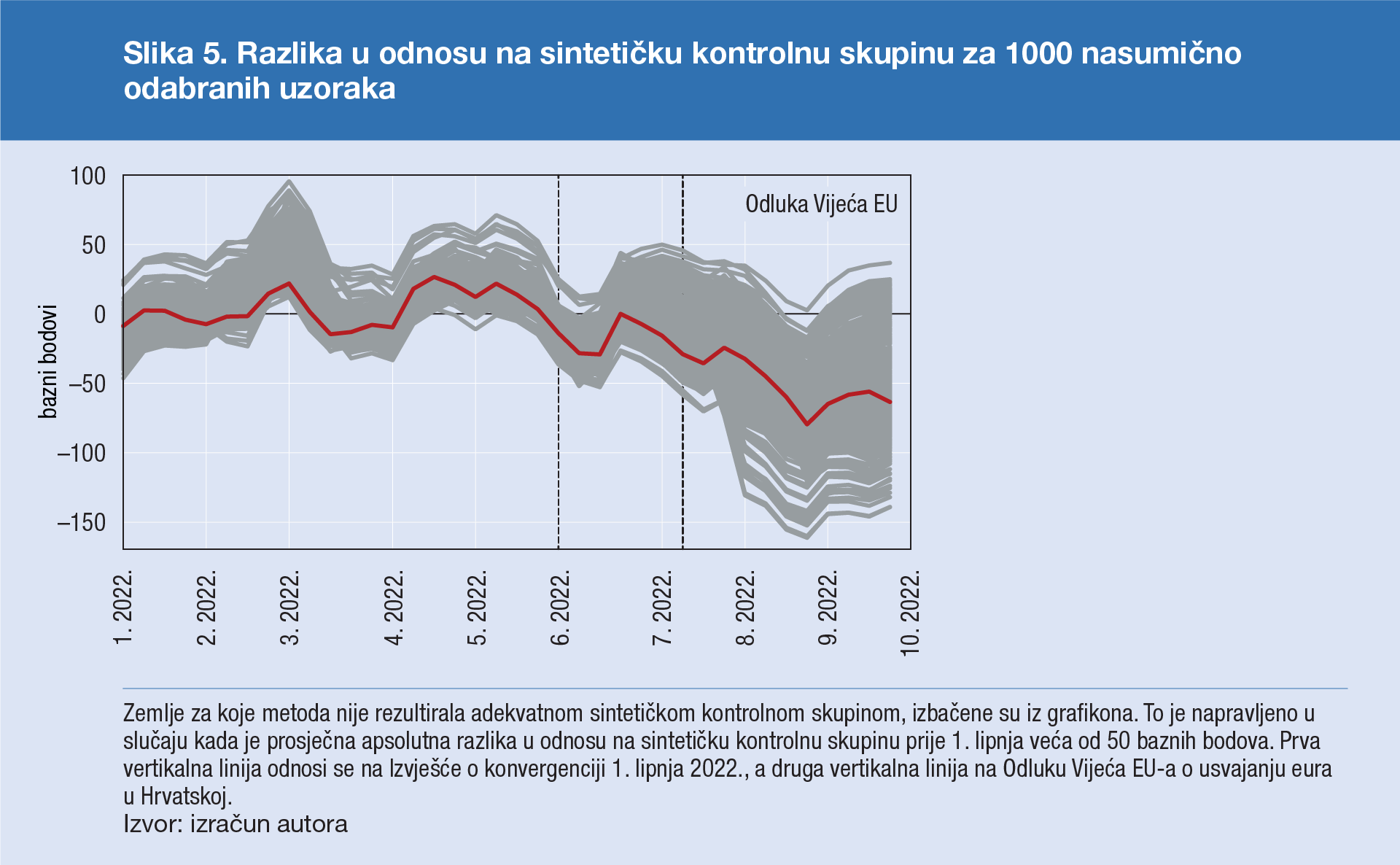 Postoji mogućnost da prikazani rezultat ovisi o određenoj zemlji ili grupi zemalja u sintetičkoj kontrolnoj skupini. Primjerice, možda se u srpnju za važnu zemlju u kontrolnoj skupini dogodio neki specifični šok pa mjerimo učinak toga šoka, a ne učinak uvođenja eura. Možda je rat u Ukrajini baš u srpnju posebice utjecao na kretanje prinosa Rumunjske. Kako bismo procijenili utječe li odabir pojedinih zemalja u kontrolnu skupinu na rezultat, tisuću puta nasumično odabiremo potencijalne "donore" (tj. članove kontrolne skupine) na način da svaka zemlja ima jednaku vjerojatnost da se pojavi u uzorku. Zatim na svakom novo odabranom uzorku primjenjujemo metodu sintetičke kontrole. Slika 5. pokazuje da čak i s nasumično odabranim potencijalnim uzorkom zemalja u velikoj većini slučajeva dolazimo do manjih prinosa u odnosu na sintetičku kontrolnu skupinu. To upućuje na zaključak da rezultat ne ovisi o specifičnoj grupi zemalja u kontrolnoj skupini.
