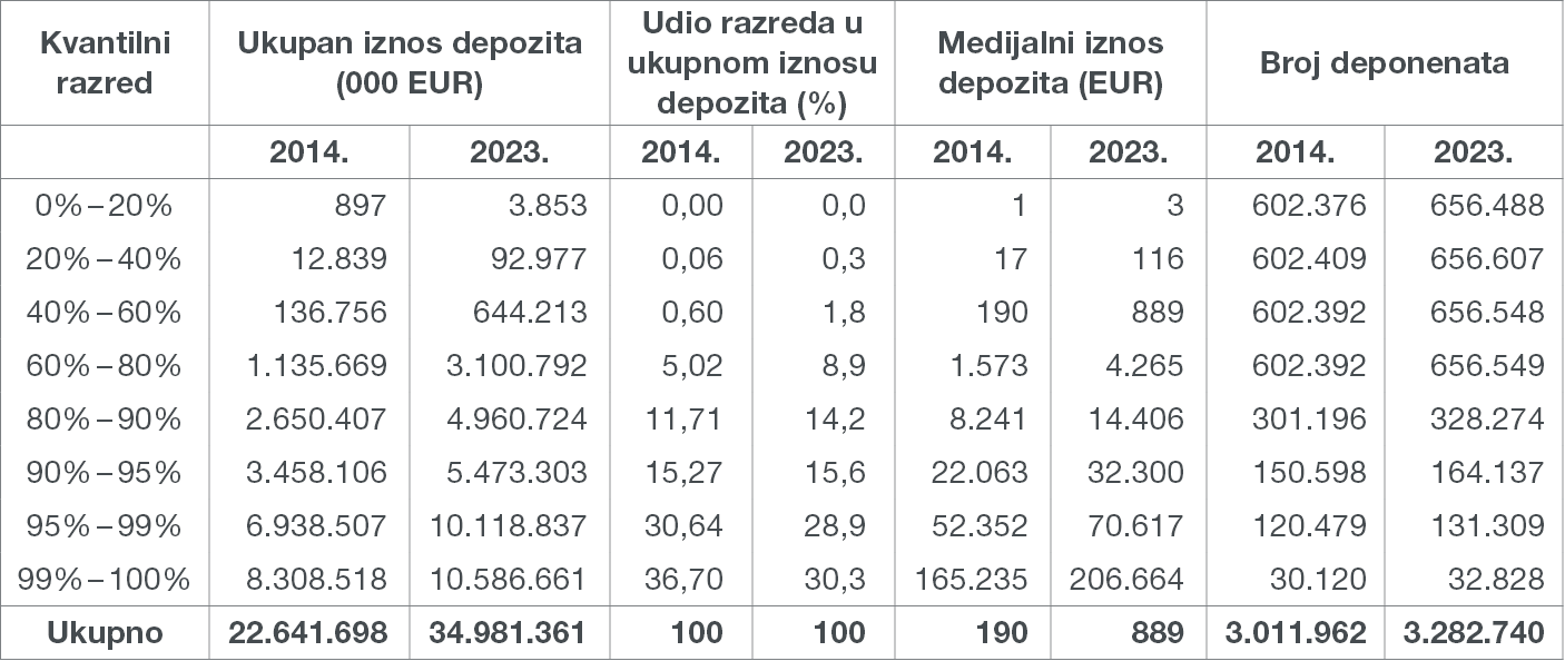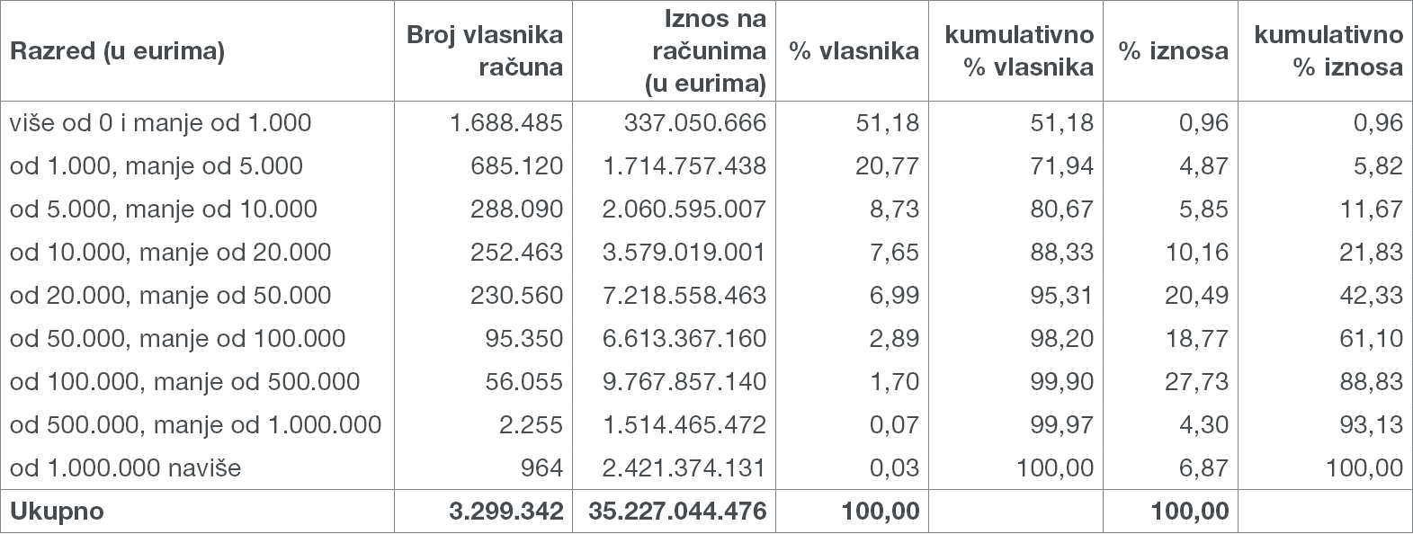 Nešto manje od 81% vlasnika s nižim iznosima depozita – manje od 10 tisuća eura po vlasniku – drži nešto manje od 12% ukupnih depozita. Istodobno, manje od 2% vlasnika s najvišim iznosima depozita, sa 100 tisuća eura i više po vlasniku, drži oko 39% ukupnih depozita. Između tih dviju kategorija nalazi se nešto više od 17% vlasnika koji raspolažu s više od 10 tisuća, ali manje od 100 tisuća eura, a drže oko 49% ukupnih depozita (Tablica 1.).
