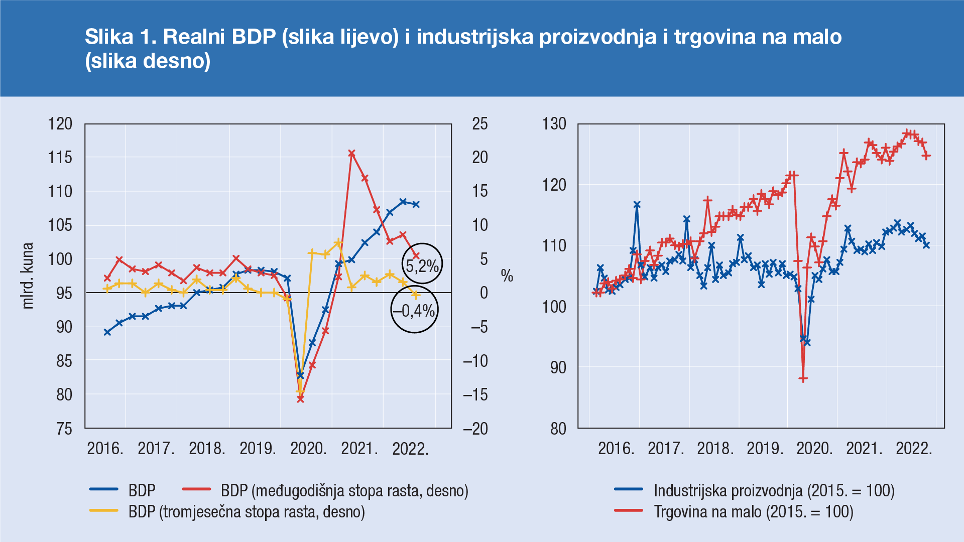 Smanjenje razine gospodarske aktivnosti u trećem tromjesečju ove godine i nepovoljne prognoze za sljedeću godinu aktualizirali su pitanje ulazi li Hrvatska u novu recesiju. Početkom 2022. svjetsko gospodarstvo obilježila je geopolitička neizvjesnost zbog rata u Ukrajini. Rat je intenzivirao već postojeće probleme u lancima opskrbe koji su se pojavili kao posljedica pandemije, dodatno je ubrzao rast cijene energenata te naposljetku negativno utjecao na ionako povišenu inflaciju. Sve se to, uz učinke izrazito brzog i snažnog pooštravanja monetarne politike, već sada nepovoljno odražava na gospodarsku aktivnost, uz vrlo pesimistična očekivanja prognostičara za sljedeću godinu. Neki glavni pokazatelji domaće ekonomske aktivnosti, primjerice realni BDP, trgovina na malo i industrijska proizvodnja, upućuju na snažno usporavanje gospodarskog rasta ili čak pad gospodarske aktivnosti u Hrvatskoj, ali i većem broju zemalja u Europi i svijetu. Na nepovoljna je kretanja reagirao i najnoviji pokazatelj vjerojatnosti recesijskog stanja domaćega gospodarstva procijenjen na temelju makroekonomskih pokazatelja za listopad ove godine. Vjerojatnost recesijskog stanja tako posljednjih mjeseci raste i trenutačno iznosi nešto više od 25%. To nije dovoljno za utvrđivanje ulaska gospodarstva u fazu recesije, ali svakako nalaže pažljivo praćenje kretanja u idućim mjesecima. Zanimljivo je primijetiti i kako je sadašnja epizoda prva u promatranom razdoblju dužem od dvadeset godina u kojoj je konstruirani mjesečni pokazatelj gospodarske aktivnosti razmjerno dugo negativan (čak sedam mjeseci zaredom, Slika 2. desno zaokruženo), a da vjerojatnost recesije nije premašila 50%. Takvo, relativno neuobičajeno kretanje gospodarske aktivnosti pokazuje da je gospodarstvo već neko vrijeme na granici između recesijske i ekspanzijske faze. U prošlim bi epizodama nepovoljnih kretanja, primjerice tijekom pandemije ili globalne financijske krize, procijenjeni pokazatelj ekonomske aktivnosti mnogo brže i snažnije potonuo u negativan teritorij. Ovakva dinamika indeksa, uz nastavak sličnih kretanja i u sljedećim mjesecima, zasad upućuje na to da će se vjerojatnost ulaska u fazu relativno plitke recesije domaćega gospodarstva dodatno povećati. No, za konačnu odluku o eventualnom početku recesije, kao i o njezinu karakteru (plitka/duboka, kratkotrajna/dugotrajna), valja pričekati službenu makroekonomsku statistiku u sljedećim mjesecima.