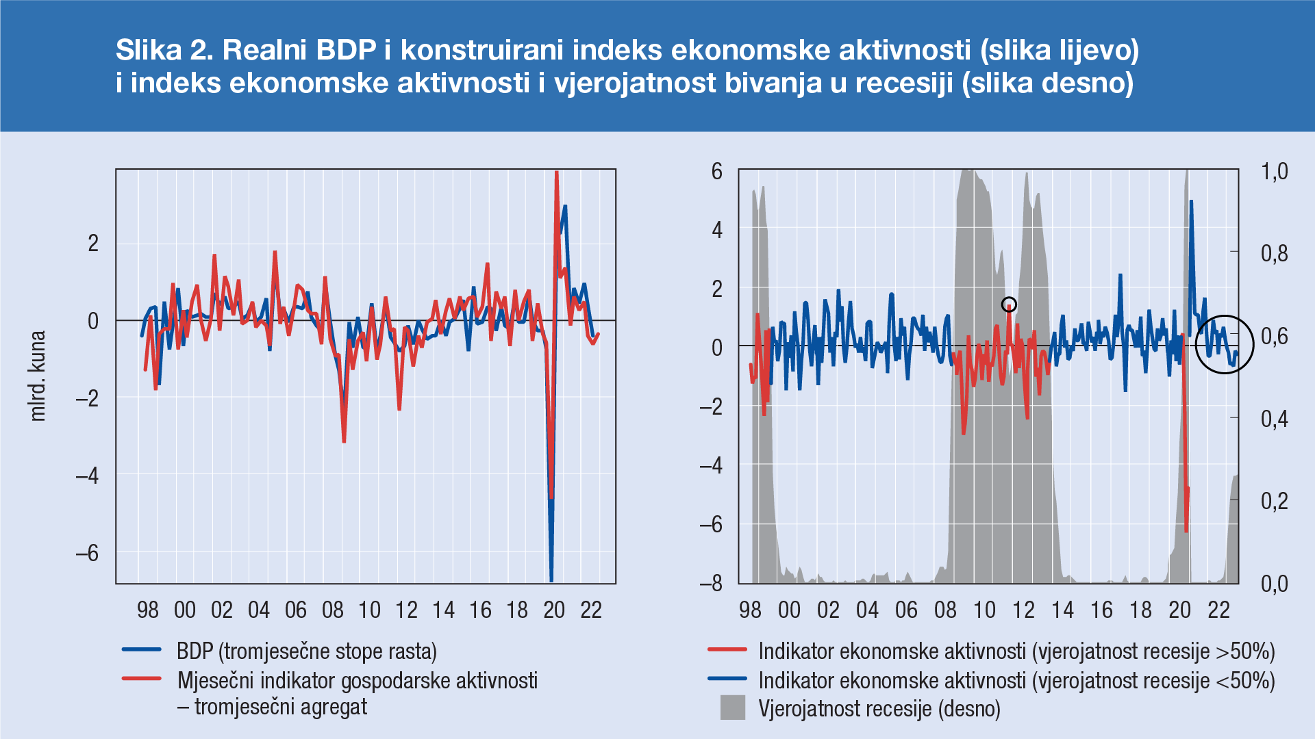 Metodologija utvrđivanja stanja ciklusa hrvatske ekonomije provodi se u dva koraka – najprije se iz niza dostupnih mjesečnih pokazatelja konstruira mjesečni sintetski indeks ekonomske aktivnosti, iz čijeg se kretanja onda, u drugom koraku, identificiraju razdoblja recesije odnosno ekspanzije, kao i točke preokreta poslovnog ciklusa. Konstruirani mjesečni indeks realne aktivnosti RH temelji se na kretanju niza relevantnih ekonomskih pokazatelja: realne trgovine na malo, industrijske proizvodnje, podataka o fiskalizaciji, indeksa građevinskih radova, broja osiguranika kod HZMO-a, broja nezaposlenih osoba, bruto plaća, izvoza i uvoza robe i usluga, kredita, CROBEX-a i inflacije.[3] Konstruirani mjesečni indikator prikazan na tromjesečnoj razini vrlo blisko prati kretanje službene serije tromjesečnog rasta realnog BDP-a, što znači da se on zaista može interpretirati kao pokazatelj realne aktivnosti za Hrvatsku (Slika 2. lijevo). U odnosu na BDP konstruirani indeks ima važnu prednost u kontekstu detektiranja recesije jer su korišteni podaci ažurniji i dostupni na mjesečnoj razini, što omogućuje bržu i češću evaluaciju faze poslovnog ciklusa. U drugom koraku, s pomoću jednostavnoga ekonometrijskog modela (tzv. Markovljeva switching modela),[4] izoliraju se razdoblja prosječnoga pozitivnog rasta od onih obilježenih negativnim rastom indeksa realne aktivnosti.[5] Osim samog razdvajanja razdoblja nepovoljnog i povoljnog kretanja gospodarske aktivnosti, ta metodologija ujedno omogućuje ažurnu procjenu vjerojatnosti da je domaće gospodarstvo u svakom od ta dva moguća stanja. Procijenjena je vjerojatnost "kontinuirana" mjera stanja gospodarstva, a ona se obično pretvara u "binarnu" ocjenu (da ili ne) primjenom granice vjerojatnosti recesije od 50%.[6]