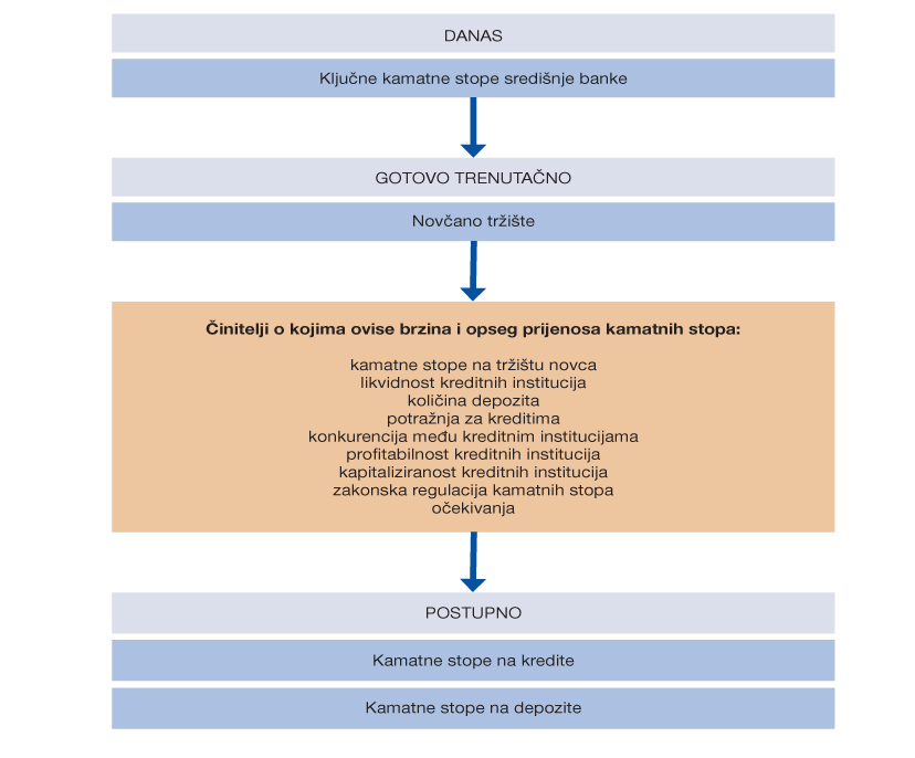 Promjena službenih kamatnih stopa središnje banke brzo i izravno utječe na kamatne stope na tržištu novca, odnosno na kamatne stope u međusobnom trgovanju kreditnih institucija novcem. Međutim, dok je prijenos ključnih kamatnih stopa na novčano tržište gotovo potpun i trenutačan, prijenos na kamatne stope na ostale kredite i depozite neizravan je i tek postupan tijekom određenog razdoblja. Kreditne institucije diskrecijski određuju kamatne stope na depozite i kredite pod utjecajem brojnih činitelja, od kojih je monetarna politika tek jedan. Ti činitelji mogu biti konkurencija, očekivanja, potražnja za kreditima, zakonska regulacija kamatnih stopa, profitabilnost kreditnih institucija i njihova kapitaliziranost itd. Sve to može utjecati na razlike u opsegu i brzini prijenosa promjena ključnih kamatnih stopa na financijsko tržište između zemalja i tijekom vremena.
