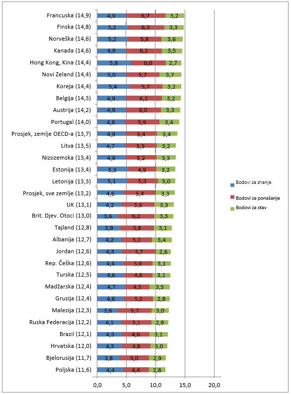 Napomena: Prosjek, sve zemlje i prosjek, zemlje OECD-a iskazuju srednju vrijednost postotka za zemlju/gospodarstvo. Stoga je svakoj zemlji / svakom gospodarstvu dodijeljen jednak ponder. Južnoafrička Republika nije uključena u popis jer nije postavila sva pitanja koja se odnose na ponašanje.