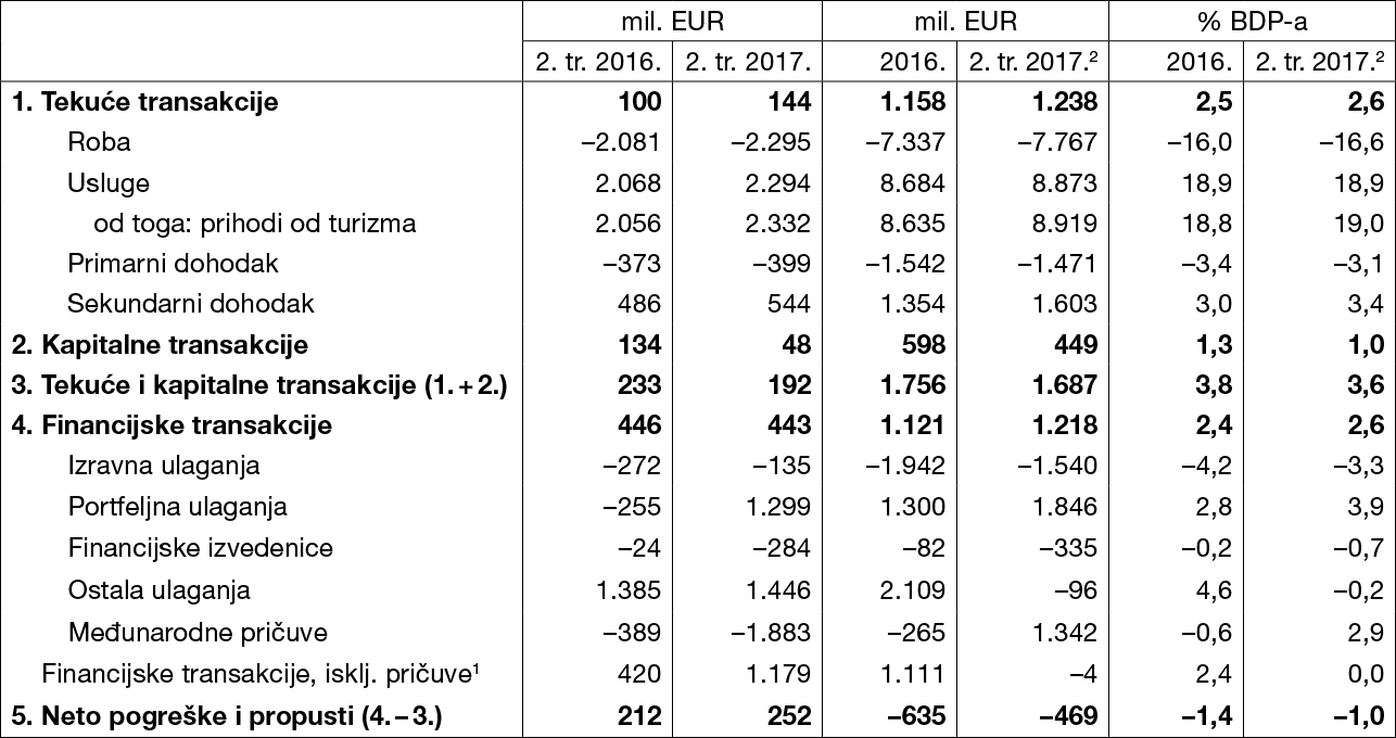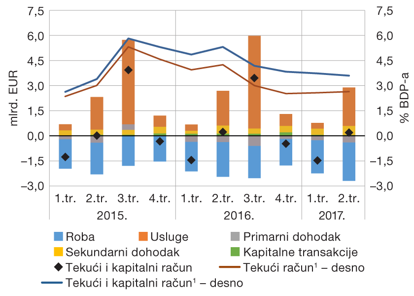 Na tekućem i kapitalnom računu platne bilance u drugom tromjesečju 2017. ostvaren je višak od 0,2 mlrd. EUR, malo manje nego u istom razdoblju prethodne godine. Manjak u robnoj razmjeni s inozemstvom povećao se za 0,2 mlrd. EUR, u gotovo podjednakom iznosu povećao se neto izvoz usluga, a blago su se pogoršali saldo na računu primarnog dohotka i zbroj salda sekundarnog dohotka i kapitalnih transakcija. Promatraju li se posljednja četiri tromjesečja, višak na tekućem i kapitalnom računu platne bilance na kraju drugog tromjesečja 2017. iznosio je 3,6% BDP-a. Pritom se nastavio njegov blagi pad, poglavito zbog rasta manjka u robnoj razmjeni.
