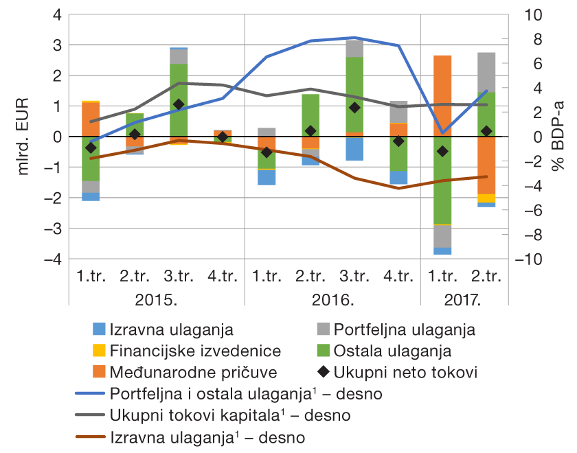 Na financijskom računu platne bilance u drugom tromjesečju 2017. zabilježen je neto odljev kapitala (smanjenje neto inozemnih obveza) od 0,4 mlrd. EUR, uglavnom zahvaljujući neto inozemnom razduživanju domaćih sektora. Promatrano po pojedinim računima snažno smanjenje neto obveza ostvareno je na računima ostalih i portfeljnih ulaganja, što se financiralo smanjenjem međunarodnih pričuva.