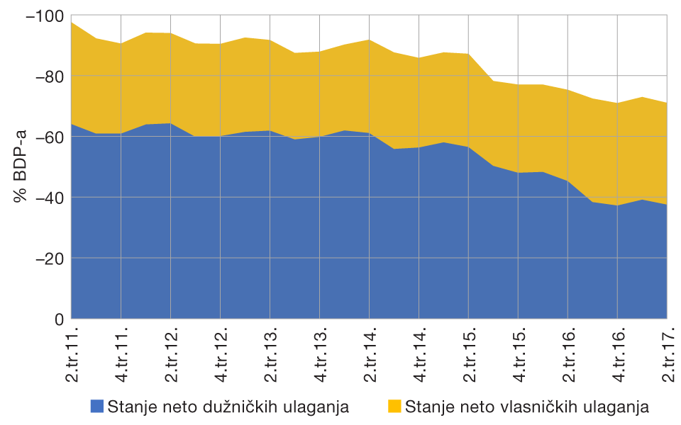 Opisana kretanja na financijskom računu platne bilance rezultirala su i blagim poboljšanjem stanja neto međunarodnih ulaganja RH tijekom drugog tromjesečja 2017., i to zbog poboljšanja neto dužničke pozicije domaćih sektora, dok se na osnovi vlasničkih ulaganja nastavio trend blagog rasta neto obveza prema inozemstvu. Na kraju drugog tromjesečja 2017. stanje neto međunarodnih ulaganja iznosilo je –33,3 mlrd. EUR, a relativni pokazatelj poboljšao se na –71,0% BDP-a (Slika 2.).