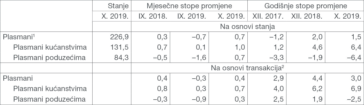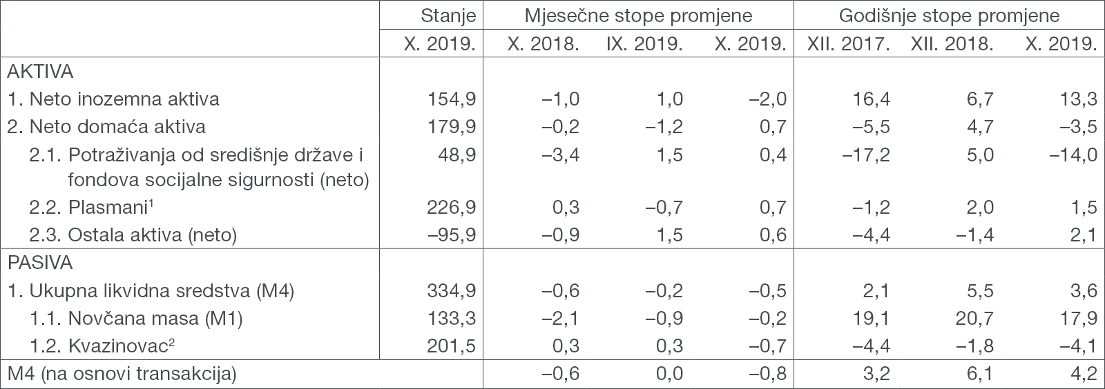 Total liquid assets (M4) stood at HRK 334.9bn at the end of October 2019, down 0.8% from the previous month (based on transactions, Table 1). If analysed on an annual basis, the growth in total liquid assets (M4) slowed down to 4.2% in October 2019 (Figure 1). The annual fall of quasi-money deepened to –2.6% (based on transactions) at the end of the month, while the annual growth of money (M1) accelerated to 17.0%, mostly due to the acceleration in the growth of demand deposits.