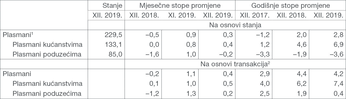 Ukupni plasmani monetarnih institucija domaćim sektorima (osim središnje države) povećali su se u prosincu za 1,0 mlrd. kuna, a njihov se godišnji rast ubrzao na 4,2% na osnovi transakcija (Slika 2.). Pritom su plasmani nefinancijskim poduzećima, nakon šest uzastopnih mjeseci smanjenja, na kraju 2019. zabilježili porast na godišnjoj razini od 0,4%. Tome je, osim neznatnog povećanja novog zaduživanja, u najvećoj mjeri pridonijelo iščezavanje većeg dijela negativnog učinka aktiviranja državnih jamstava brodogradilištima krajem prošle godine, a preostali će dio tih učinaka iščeznuti početkom ove godine. Kada je riječ o stanovništvu, godišnji rast plasmana tom sektoru u prosincu se ubrzao na 7,4% (Tablica 2.). Snažniji rast plasmana stanovništvu bio je potaknut poglavito nastavkom ubrzavanja godišnjeg rasta stambenih kredita, koji je krajem 2019. iznosio 6,4%, što zasigurno odražava i učinke nastavka provođenja programa Vlade RH za subvencioniranje stambenih kredita. Istodobno se godišnji rast gotovinskih nenamjenskih kredita neznatno ubrzao na 11,5%. Godišnji rast nominalnog stanja plasmana, koji je u prosincu iznosio 2,8%, bio je manji od rasta na osnovi transakcija, što je uglavnom bilo posljedica prodaja nenaplativih plasmana poduzećima.