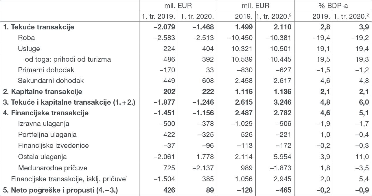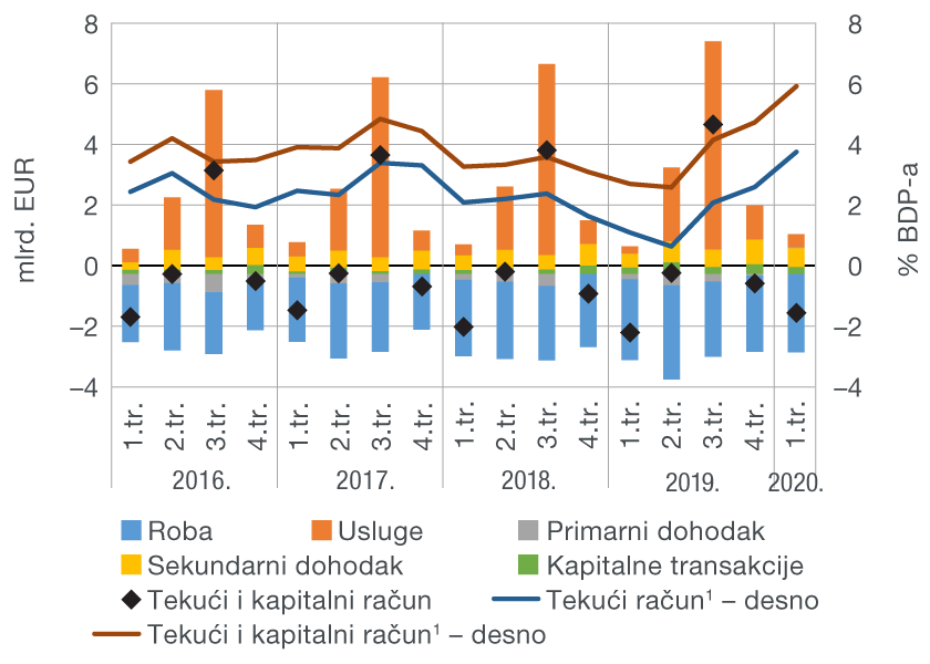 Na tekućem i kapitalnom računu platne bilance u prvom je tromjesečju 2020. zabilježen manjak u iznosu od 1,2 mlrd. EUR, što je za 0,6 mlrd. EUR povoljniji rezultat u odnosu na ostvarenje u istom razdoblju prethodne godine. Tome je gotovo podjednako pridonijelo poboljšanje salda na računu primarnog dohotka, povećanje neto izvoza usluga te rast ukupnog viška na računima sekundarnog dohotka i kapitalnih transakcija, dok je doprinos kretanja u robnoj razmjeni s inozemstvom, iako također povoljan, bio nešto manji. Promatraju li se posljednja četiri tromjesečja, višak na tekućem i kapitalnom računu iznosio je 6,0% BDP-a te se dodatno povećao u odnosu na cijelu 2019. godinu, kada je iznosio 4,8% BDP-a.