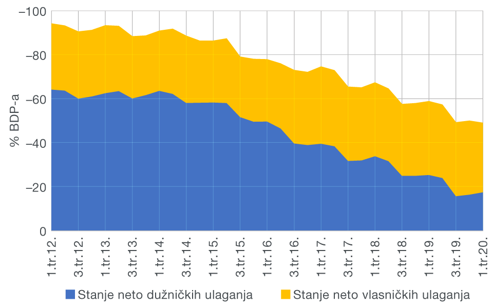 Unatoč neto priljevu kapitala na financijskom računu platne bilance zbog međuvalutnih i ostalih prilagodba stanje neto međunarodnih ulaganja u prvom se tromjesečju 2020. blago poboljšalo. Tako je na kraju ožujka 2020. stanje neto međunarodnih ulaganja iznosilo –26,5 mlrd. EUR ili –49,0% BDP-a, što je za 0,4 mlrd. EUR, odnosno 1,0 postotni bod manje nego na kraju 2019., odnosno za 9,9 postotnih bodova manje u odnosu na kraj istog razdoblja prethodne godine (Slika 2.).