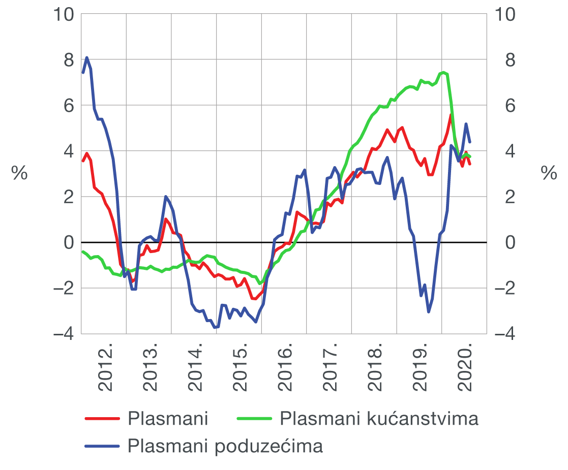Ukupni plasmani monetarnih institucija domaćim sektorima (osim središnje države) u kolovozu su se smanjili za 0,5 mlrd. kuna (na osnovi transakcija). Gotovo je jednako iznosila i promjena kredita u tom mjesecu, koja je uglavnom rezultat pada kredita nefinancijskim poduzećima u trgovini i prerađivačkoj industriji, dok su krediti stanovništvu stagnirali u odnosu na prethodni mjesec. Pritom se mjesečni rast stambenih kredita usporio na 0,4%, dok su gotovinski nenamjenski krediti zabilježili pad od 0,2%. Promatrano na godišnjoj razini, rast se ukupnih plasmana usporio na 3,4% (Slika 2.), a kredita na 3,9%, što je većim dijelom posljedica usporavanja kredita poduzećima s 5,5% u srpnju na 4,7% u kolovozu (Tablica 2.). Kada je riječ o stanovništvu, godišnji rast kredita ovom sektoru blago se usporio, s 3,9% u srpnju na 3,8% u kolovozu, čemu je pridonijelo usporavanje rasta gotovinskih nenamjenskih kredita (s 2,8% na 2,0%), dok se rast stambenih kredita nastavio ubrzavati (s 8,0% na 8,3%) pod utjecajem zaduživanja u svrhu obnove stambenih jedinica oštećenih u potresu.