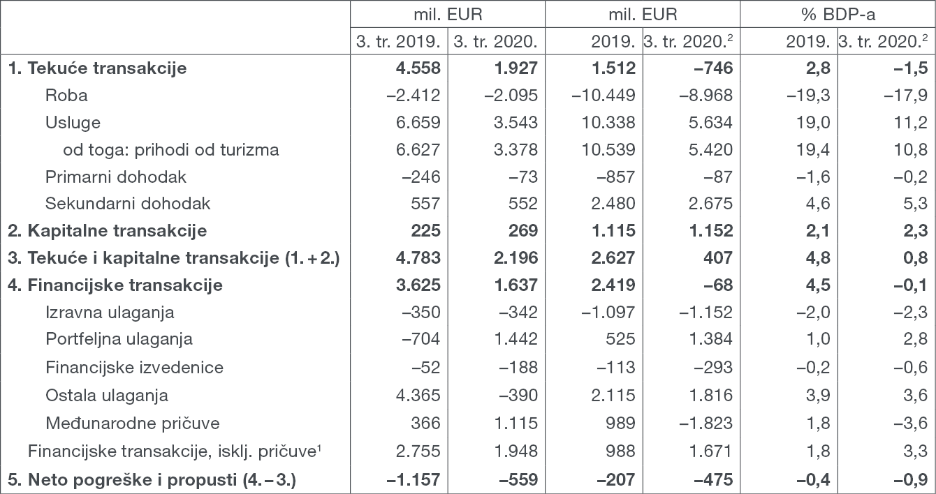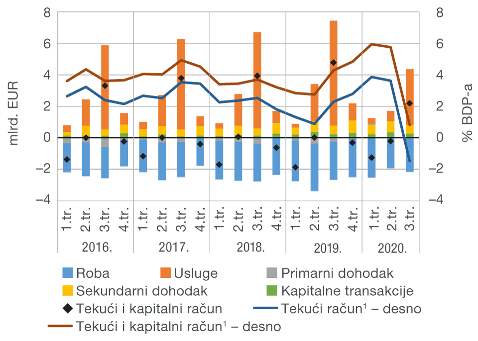 Tijekom trećeg tromjesečja 2020. zabilježeno je snažno smanjenje neto izvoza usluga (za 3,1 mlrd. EUR) u odnosu na isto razdoblje prethodne godine, ponajprije zbog izrazitog pada prihoda od turističke potrošnje stranih gostiju za 49,0% zbog pandemije koronavirusa praćene restriktivnim epidemiološkim mjerama, padom raspoloživog dohotka i promjenama u ponašanju potrošača. Za razliku od toga, nepovoljna su kretanja u razmjeni usluga djelomično ublažena smanjenjem manjka u robnoj razmjeni s inozemstvom (za 0,3 mlrd. EUR). Naime, iako je zabilježen znatan pad izvoza robe od 8,7%, kontrakcija uvoza bila je još izraženija te je iznosila 10,6%, što je zajedno s primjetno većom uvoznom bazom rezultiralo snažnim smanjenjem manjka za 13,1%.