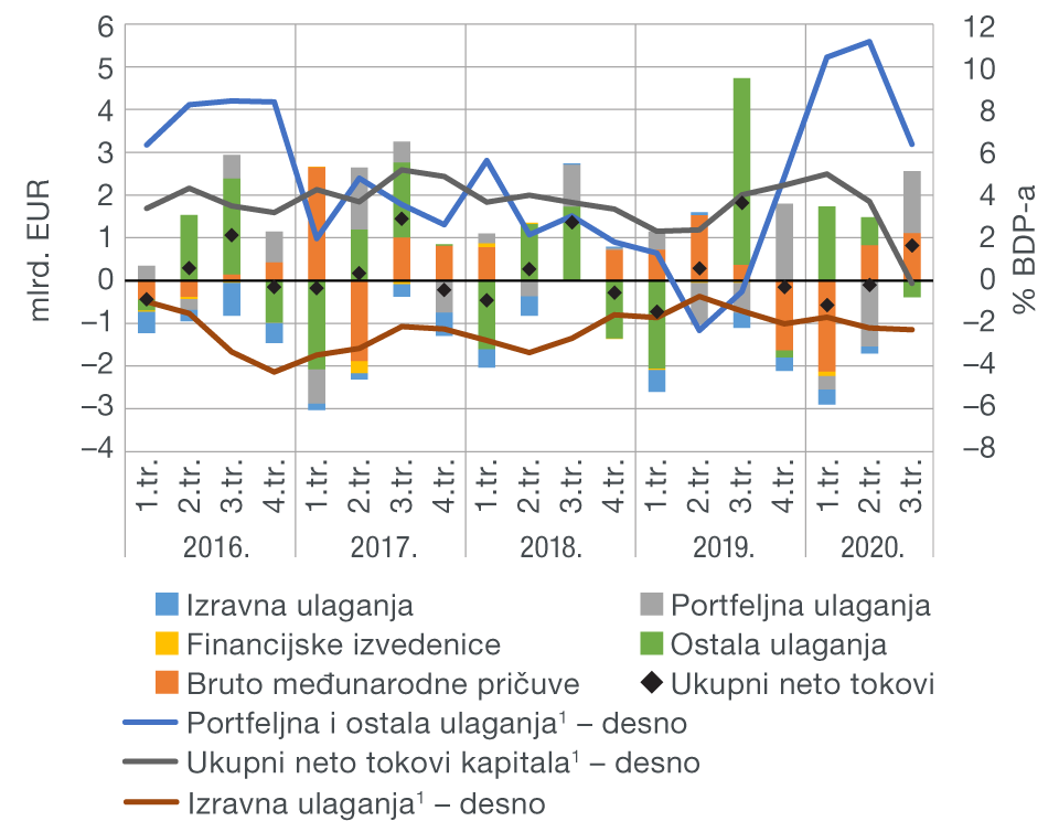 Na financijskom računu platne bilance u trećem je tromjesečju 2020. zabilježen neto odljev kapitala od 1,6 mlrd. EUR, što je za 2,0 mlrd. EUR manje nego u istom razdoblju prethodne godine (Slika 1.b). Znatno smanjenje neto odljeva zrcali ranije opisano pogoršanje kretanja na tekućem i kapitalnom računu. Promatrano po pojedinim podračunima, snažan neto odljev kapitala ostvaren je na računu portfeljnih ulaganja (1,4 mlrd. EUR), dok je, s druge strane, neto priljev kapitala zabilježen na računima ostalih (0,4 mlrd. EUR) i inozemnih izravnih ulaganja (0,3 mlrd. EUR). Istodobno su se bruto međunarodne pričuve primjetno povećale (za 1,1 mlrd. EUR) te su do kraja rujna gotovo dosegnule razinu s kraja 2019. godine. Međutim, takva su kretanja bila pod snažnim utjecajem povećanja obujma repo poslova središnje banke s inozemstvom, koje je povećalo bruto međunarodne pričuve i obveze središnje banke na računu ostalih ulaganja za 1,4 mlrd. EUR.