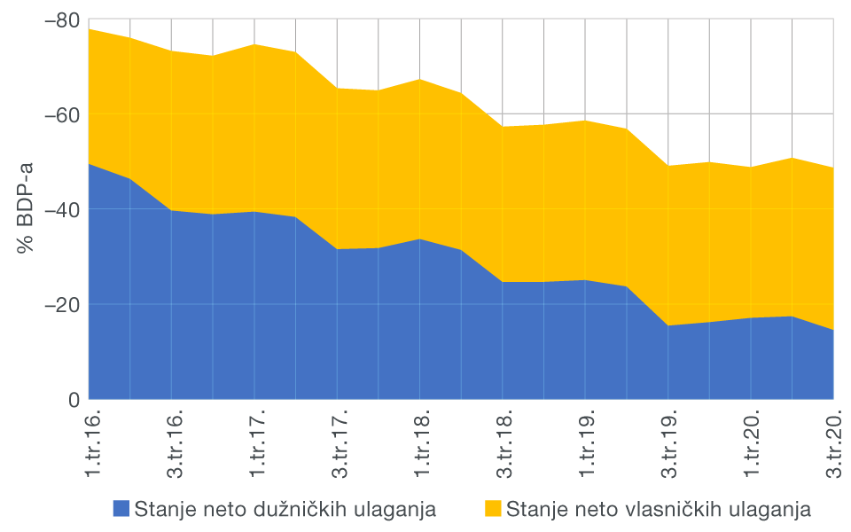 Snažno smanjenje neto inozemnog duga rezultiralo je primjetnim poboljšanjem stanja neto međunarodnih ulaganja s –26,4 mlrd. EUR na kraju drugog na –24,4 mlrd. EUR na kraju trećeg tromjesečja 2020. godine. Pritom se poboljšala neto inozemna pozicija države i banaka, a u nešto manjoj mjeri i ostalih domaćih sektora, dok se pogoršala samo neto inozemna pozicija središnje banke (Slika 3.a). Relativni se pokazatelj stanja neto međunarodnih ulaganja poboljšao za 2,0 postotna boda u odnosu na kraj lipnja i na kraju rujna iznosio je –48,7% BDP-a (Slika 3.b).
