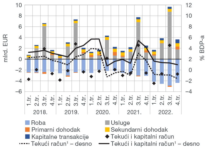 Na tekućem i kapitalnom računu platne bilance u četvrtom je tromjesečju 2022. ostvaren manjak od 0,7 mlrd. EUR, što je za 0,2 mlrd. EUR više nego u istom razdoblju prethodne godine (Slika 1.a). To je isključivo rezultat snažnog povećanja manjka u robnoj razmjeni s inozemstvom, poglavito zbog rasta neto uvoza energenata, dok su kretanja na svim ostalim podračunima bila povoljnija negoli u istom razdoblju prethodne godine, što je tek djelomično ublažilo spomenuto produbljivanje manjka u robnoj razmjeni. Tako se tijekom posljednja tri mjeseca 2022. primjetno povećao neto izvoz usluga, ponajprije zahvaljujući rastu prihoda od turizma, a istodobno je zabilježen izrazit rast ukupnog viška na računima sekundarnog dohotka i kapitalnih transakcija, ponajviše zbog rekordnih isplata sredstava krajnjim korisnicima iz fondova EU-a. Znatno manje izraženo, kretanjima na tekućem i kapitalnom računu pozitivno je pridonijelo i povećanje viška na računu primarnog dohotka. Kao rezultat opisanih kretanja, kao i nepovoljnih ostvarenja u prvoj polovini godine, u cijeloj 2022. ukupan višak na tekućem i kapitalnom računu osjetno se smanjio te je iznosio 1,0% BDP-a, u odnosu na 4,2% BDP-a ostvarenih u 2021. godini.