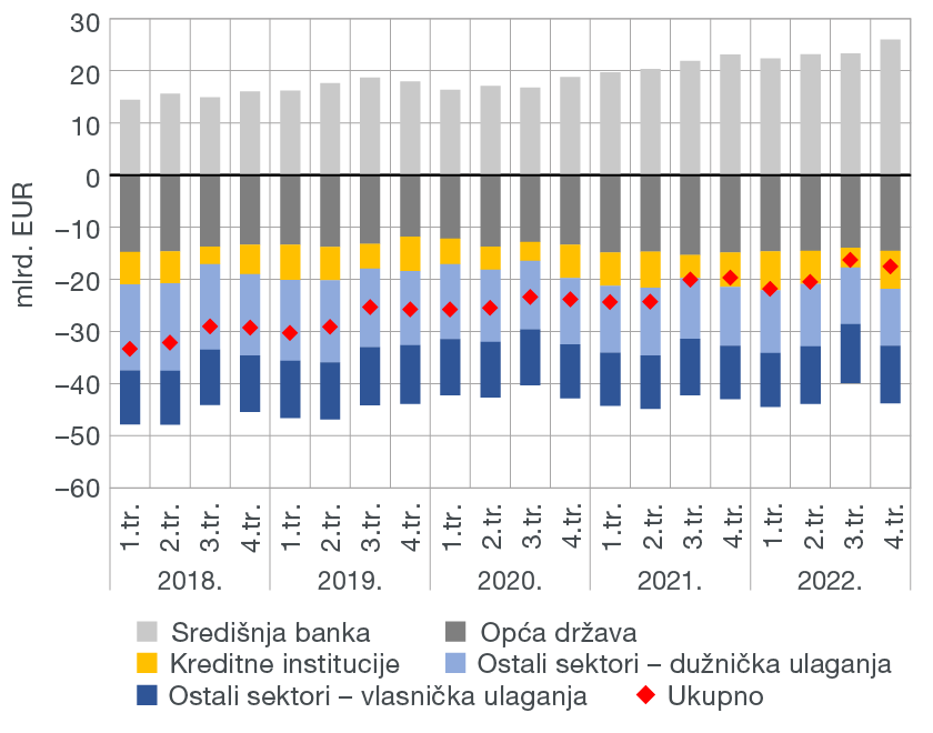 Napomena: Stanje neto međunarodnih ulaganja jednako je razlici između inozemne imovine i inozemnih obveza domaćih sektora na kraju razdoblja. Negativna vrijednost stanja neto međunarodnih ulaganja pokazuje da su inozemne obveze hrvatskih rezidenata veće od njihove inozemne imovine. Obuhvaćeni su imovina i obveze na osnovi dužničkih instrumenata, vlasničkih ulaganja, financijskih izvedenica i ostalo. Na Slici 3.b u neto dužnička ulaganja uključene su financijske izvedenice i ostale obveze.