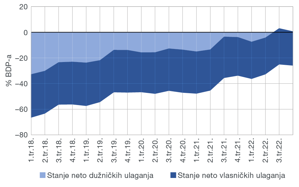 Uz rast bruto inozemnog duga, na povećanje neto inozemnog duga u trećem tromjesečju (za 0,8 mlrd. EUR) odrazilo se i snažno smanjenje inozemne imovine poslovnih banaka, što je tek djelomično ublaženo prethodno opisanim rastom međunarodnih pričuva. Tako je stanje neto inozemnog duga na kraju 2022. iznosilo 0,3 mlrd. EUR ili 0,4% BDP-a u usporedbi s negativnim ostvarenjem od –0,7 mlrd. EUR ili –1,0% BDP-a na kraju rujna te godine. Prema tome pogoršalo se i stanje neto međunarodnih ulaganja s –16,3 mlrd. EUR ili –25,0% BDP-a na kraju rujna na –17,5 mlrd. EUR ili –25,9% BDP-a na kraju prosinca 2022. godine (slike 3.a i b).