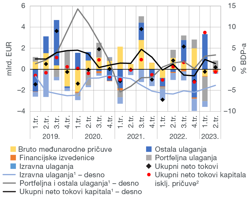 Neto odljev kapitala na financijskom računu platne bilance u drugom je tromjesečju 2023. iznosio 0,2 mlrd. EUR, što je za 0,6 mlrd. EUR manje u odnosu na isto razdoblje prethodne godine (Slika 1.b). Zabilježeni neto odljev kapitala isključivo je posljedica snažnog neto odljeva na računu portfeljnih ulaganja, ponajviše zahvaljujući primjetnom porastu inozemne imovine zbog rasta ulaganja domaćih rezidenata u dužničke vrijednosne papire u inozemstvu. Za razliku od toga, u razdoblju od travnja do lipnja na svim je ostalim podračunima ostvaren neto priljev kapitala, pri čemu je bio gotovo podjednakog iznosa kod financijskih izvedenica, međunarodnih pričuva i izravnih ulaganja, dok je na računu ostalih ulaganja bio neznatan. Naime, kod financijskih izvedenica zabilježen je neto priljev s obzirom na to da je država u travnju u cijelosti isplatila međunarodnu dolarsku obveznicu za koju je zbog primjene ugovora o valutnoj zamjeni (engl. currency swap) ostvarena povoljna tečajna razlika u razdoblju do dospijeća. Istodobno, neto priljev uzrokovao je i smanjenja međunarodnih pričuva, koje se sada, nakon pristupanja europodručju, odnose isključivo na dolarski portfelj kojim upravlja HNB. Konačno, neto priljev na podračunu izravnih ulaganja bio je razmjerno skroman nakon što je priljev vlasničkih ulaganja bio negativan zbog toga što je nekoliko poduzeća u stranom vlasništvu iz prerađivačke industrije i djelatnosti pružanja smještaja isplatilo dobit iz prethodnih razdoblja te time umanjilo vrijednost vlastitoga kapitala. Pritom je akumuliranje gotovine eura pritekle iz ostatka europodručja postalo značajan oblik odljeva sredstava na financijskom računu.
