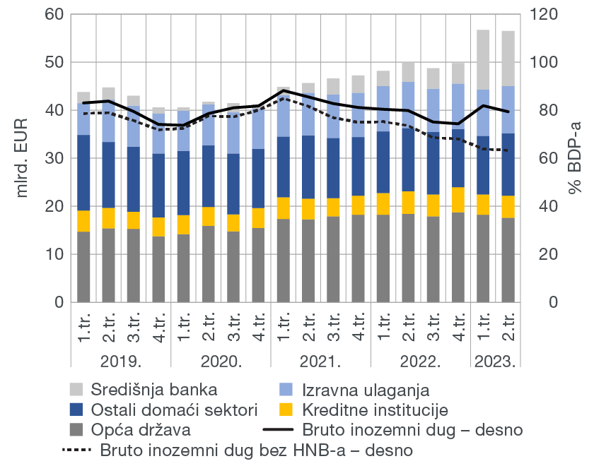 Stanje bruto inozemnog duga na kraju lipnja 2023. iznosilo je 56,5 mlrd. EUR ili 79,4% BDP-a (Slika 2.a), što je za 0,3 mlrd. EUR ili 2,6% BDP-a manje nego na kraju ožujka 2023., čemu je najviše pridonijelo smanjenje duga središnje banke i opće države praćeno rastom nominalnog BDP-a.