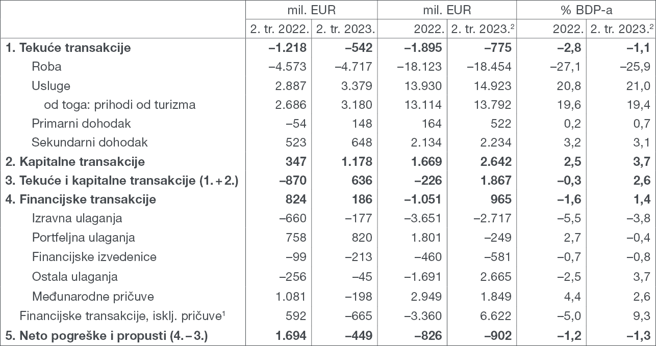 Saldo tekućeg i kapitalnog računa platne bilance znatno se poboljšao tijekom drugog tromjesečja 2023. u odnosu na isto razdoblje prethodne godine, i to poglavito kao odraz snažnog povećanja ukupnog višaka na računima sekundarnog dohotka i kapitalnih transakcija zbog rekordnih isplata sredstava iz fondova EU-a krajnjim korisnicima. U skladu s tim na financijskom računu platne bilance zabilježen je neto odljev kapitala uz poboljšanje relativnih pokazatelja inozemne zaduženosti i stanja međunarodnih ulaganja.
