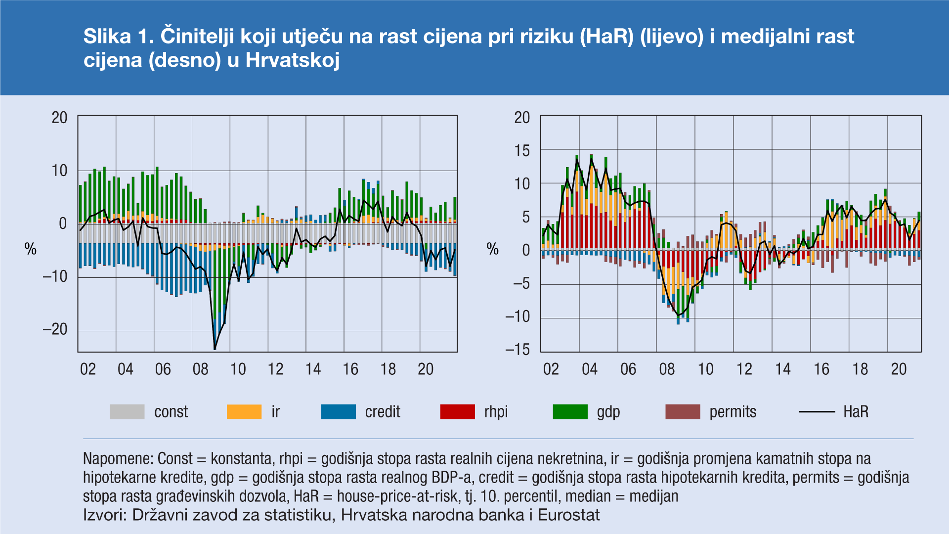 Cilj je ovog istraživanja bolje razumijevanje dinamike cijena nekretnina u Hrvatskoj, kao i kvantifikacija činitelja rizika pada cijena nekretnina, definiranjem empirijskog modela rasta pri riziku (HaR), za razdoblje od prvoga tromjesečja 2002. do trećega tromjesečja 2022. godine. Pristup se zasniva na poznatoj metodologiji prema Adrianu i ostalima (2019.), gdje se na osnovi kvantilne regresije prognozirala buduća distribucija rasta BDP-a, a ovdje to se primjenjuje za slučaj rasta cijena nekretnina. Pritom je posebna pozornost usmjerena na donji rep distribucije (u slučaju ovog rada 10. percentil), kako bi se tvrdili uzroci mogućih iznenadnih promjena cijena nekretnina koje mogu imati negativne posljedice za financijsku stabilnost.