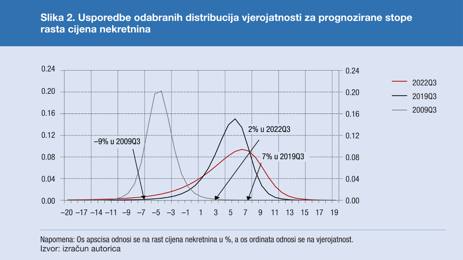Prvo, stvarni realni rast cijena (vrijednost dana u pravokutnicima) usklađen je s centrima distribucije. To upućuje na to da su najvjerojatnije prognoze i one u neposrednoj blizini korisne u svrhu prognoziranja. Drugo, promjena distribucije (oblik i položaj) tijekom vremena je značajna, i treće, širina distribucije je također važna informacija, s obzirom na to da se tijekom pada tržišta nekretnina (npr. tijekom globalne financijske krize) distribucija sužava, a njezin rep smanjuje. Nasuprot tome, ako se distribucije prije krize uzrokovane pandemijom usporede s posljednjom točkom (2022Q3), potonja je šira, a uzrok može biti u povećanoj neizvjesnosti uzrokovanoj i samom pandemijom, a kasnije i visokom inflacijom itd.