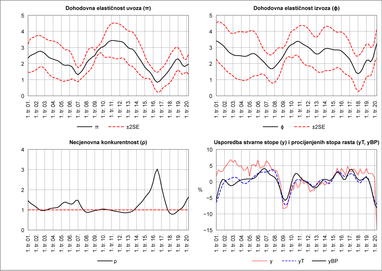 Analizu započinjemo procjenom vremenske serije kretanja neopazivih varijabla – cjenovnih i dohodovnih elastičnosti pomoću agregatnih jednadžbi izvoza i uvoza robe i usluga primjenom modela State-space i Kalmanova postupka zaglađivanja vrijednosti (engl. Kalman smoother). U funkcijama izvoza i uvoza pretpostavlja se da dohodovna elastičnost obuhvaća necjenovne karakteristike robe i usluga, poput njihove tehnološke sofisticiranosti, kvalitete i drugo, a učinak cjenovne konkurentnosti na trgovinu trebao bi biti sadržan u cjenovnoj elastičnosti. Omjer dohodovnih elastičnosti izvoza i uvoza potom se koristi za izračun kretanja necjenovne konkurentnosti Hrvatske u razdoblju 1. tr. 2000. – 2. tr. 2020., a stavljanjem opisanog omjera u odnos sa stopom rasta gospodarstva glavnih trgovinskih partnera (EU-27) izračunata je ravnotežna stopa rasta platne bilance poznata i kao Thirlwallov zakon (McCombie i Thirlwall, 1994.). Konačno, zbog velike uloge turizma i uslužnih djelatnosti u Hrvatskoj, analiza je ponovljena tako da je trgovina razdvojena između robe i usluga.