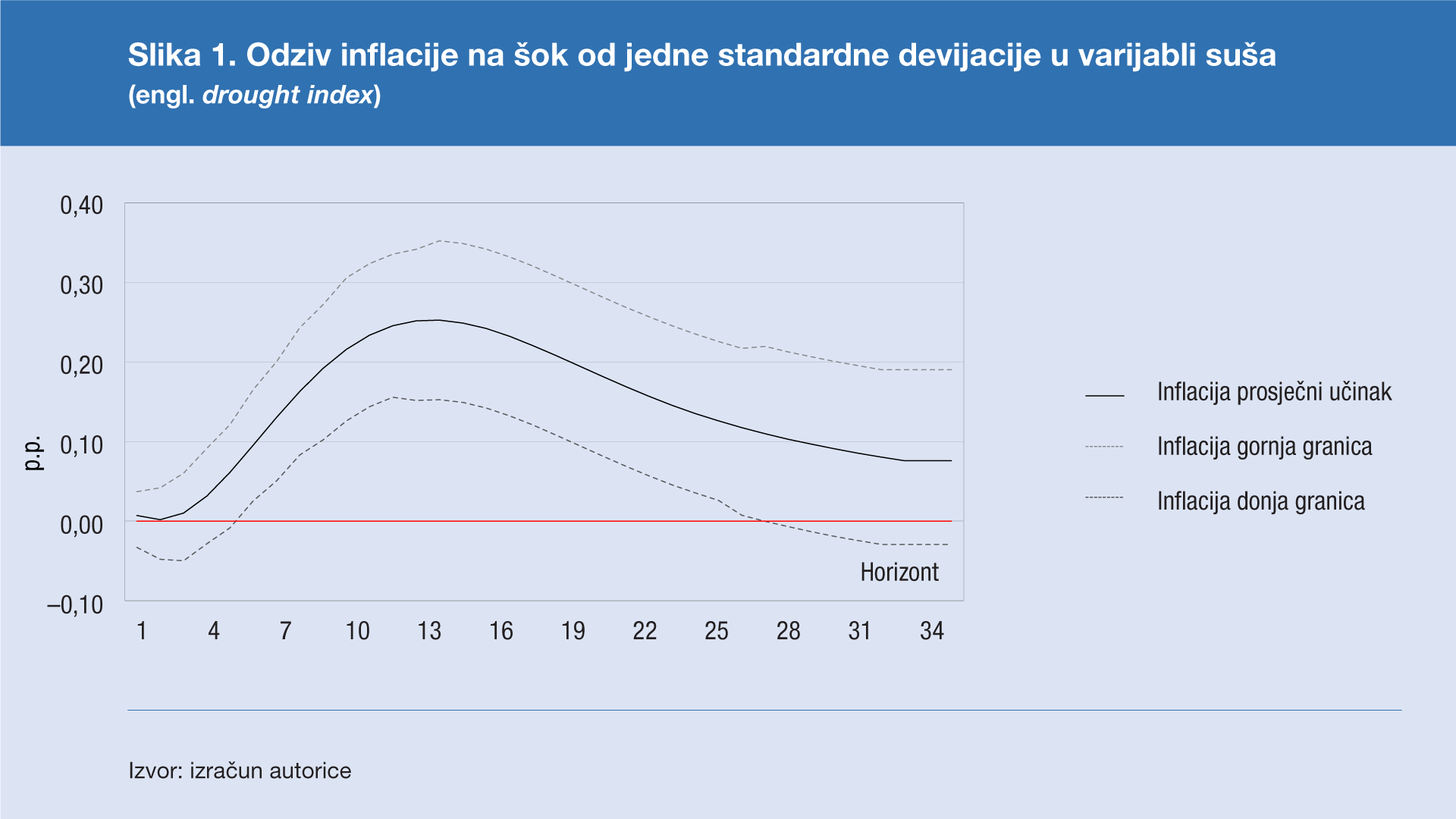 Slika 1. predočuje reakciju inflacije na šok u varijabli suša, koja predstavlja pokazatelj iznadprosječnih sušnih razdoblja, gdje se može uočiti da je učinak iznadprosječnih suša na dinamiku ukupnih cijena u Hrvatskoj prisutan nakon šest mjeseci od samoga šoka i traje gotovo dvije godine.
