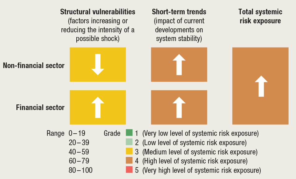The macroprudential diagnostic process consists of assessing any macroeconomic and financial relations and developments that might result in the disruption of financial stability. In the process, individual signals indicating an increased level of risk are detected, according to calibrations using statistical methods, regulatory standards or expert estimates. They are then synthesised in a risk map indicating the level and dynamics of vulnerability, thus facilitating the identification of systemic risk, which includes the definition of its nature (structural or cyclical), location (segment of the system in which it is developing) and source (for instance, identifying whether the risk reflects disruptions on the demand or on the supply side). With regard to such diagnostics, instruments are optimised and the intensity of measures is calibrated in order to address the risks as efficiently as possible, reduce regulatory risk, including that of inaction bias, and minimise potential negative spillovers to other sectors as well as unexpected cross-border effects. What is more, market participants are thus informed of identified vulnerabilities and risks that might materialise and jeopardise financial stability.