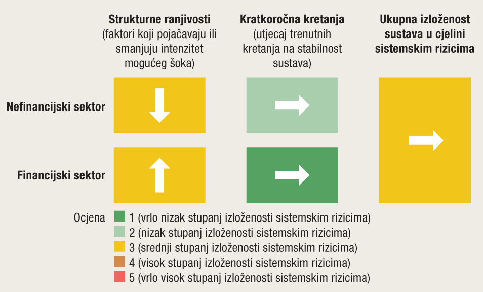 Ukupna izloženost sistemskim rizicima na kraju četvrtog tromjesečja 2019. zadržana je na umjereno visokoj razini (Slika 1.). U razdoblju povoljnih kratkoročnih kretanja u financijskom sektoru koji se očituju u poboljšanju kvalitete imovine banaka te u uvjetima visoke solventnosti i likvidnosti, došlo je do porasta strukturnih slabosti sektora zbog rastuće koncentracije prihoda te neizvjesnosti oko budućih troškova sudskih sporova. Zbog toga je ukupna ocjena rizika zadržana na razini prethodne (Makroprudencijalna dijagnostika br. 9), unatoč povoljnim makroekonomskim kretanjima koja snižavaju strukturne slabosti nefinancijskog sektora.