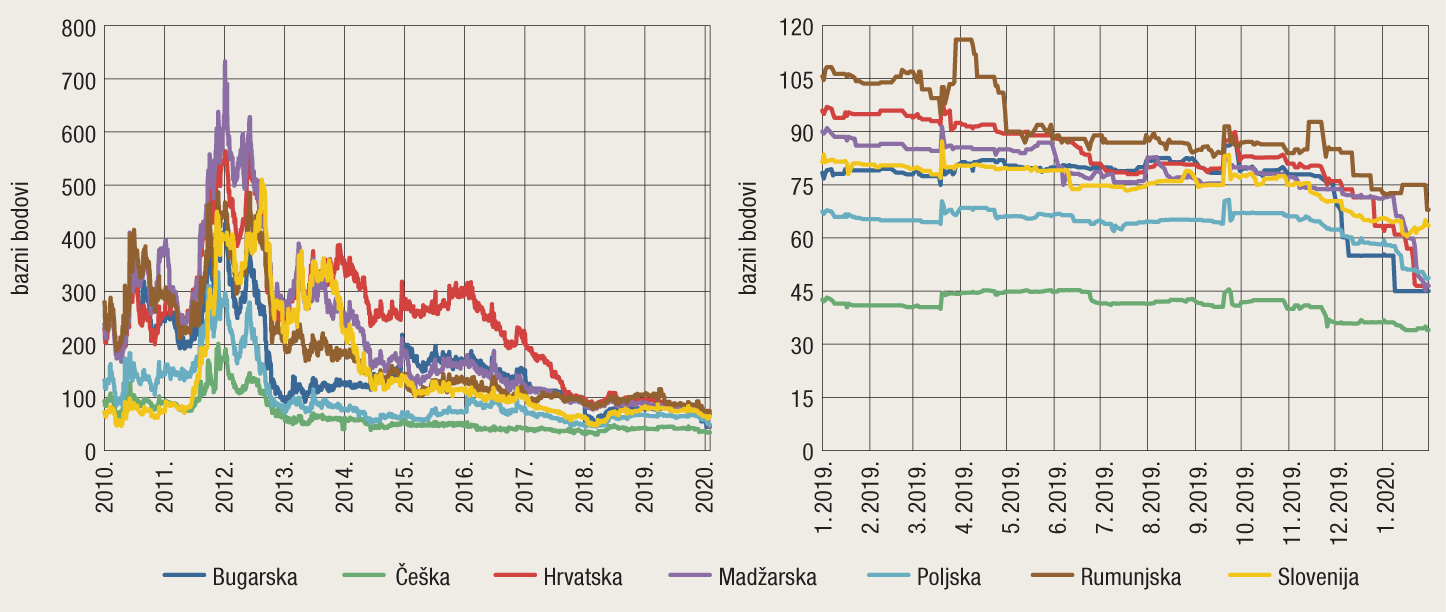 Slika 2. Kretanje premije osiguranja od kreditnog rizika (CDS) za petogodišnje obveznice za odabrane zemlje SIE-a i Hrvatsku